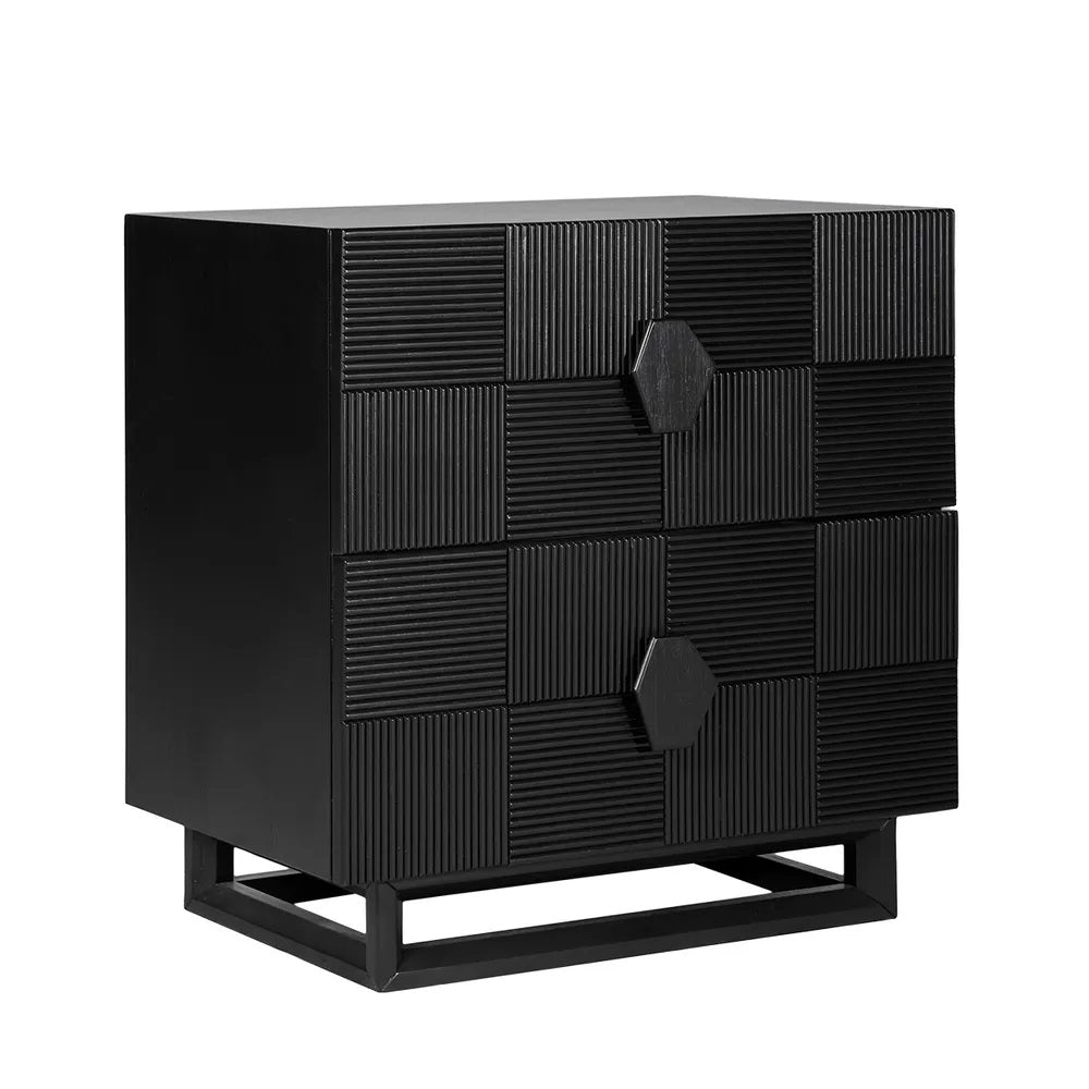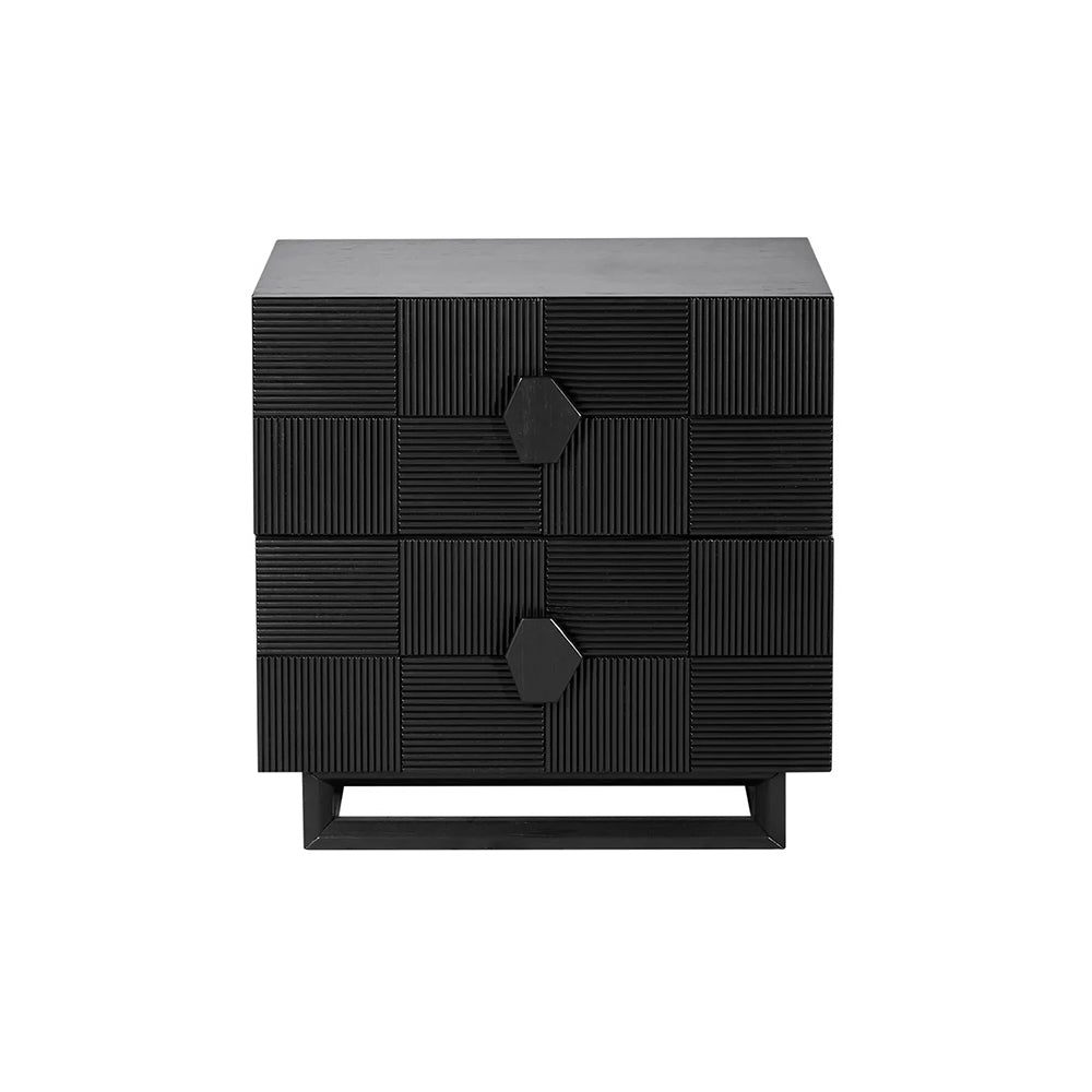 Elevate your bedroom with the Astoria Bedside Table - Large Black, a stunning two-drawer bedside Table. Crafted with an elegant black finish and intricate geometric detailing, this piece blends luxury and practicality. Spacious drawers offer convenient storage, while the sturdy open base provides visual balance, making it perfect for contemporary interiors.