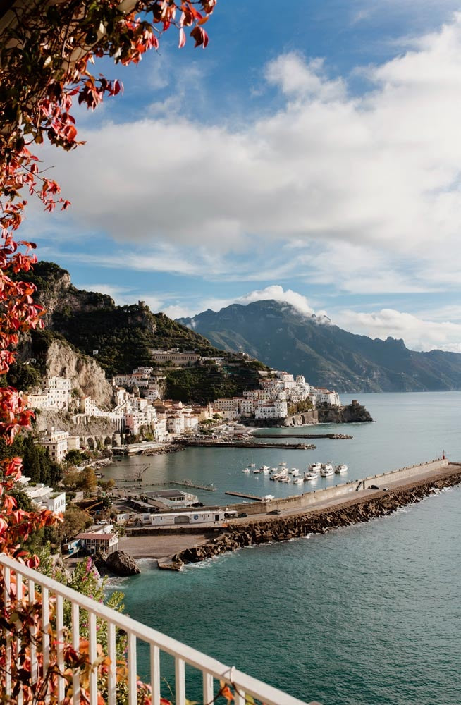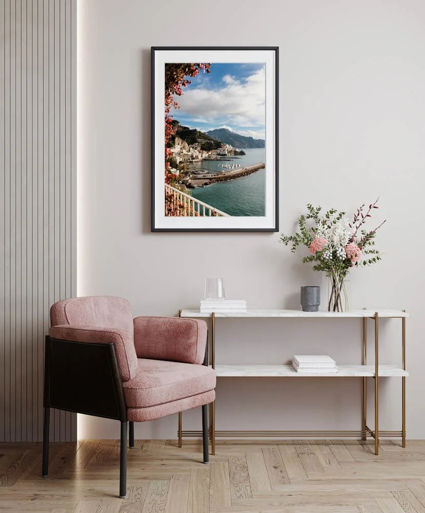 Framed by cascading vines and coastal charm, this stunning Amalfi Town View 02 print captures the iconic beauty of Amalfi from a romantic balcony view. The sunlit town, dramatic cliffs, and sparkling marina transport you straight to the Italian Riviera.