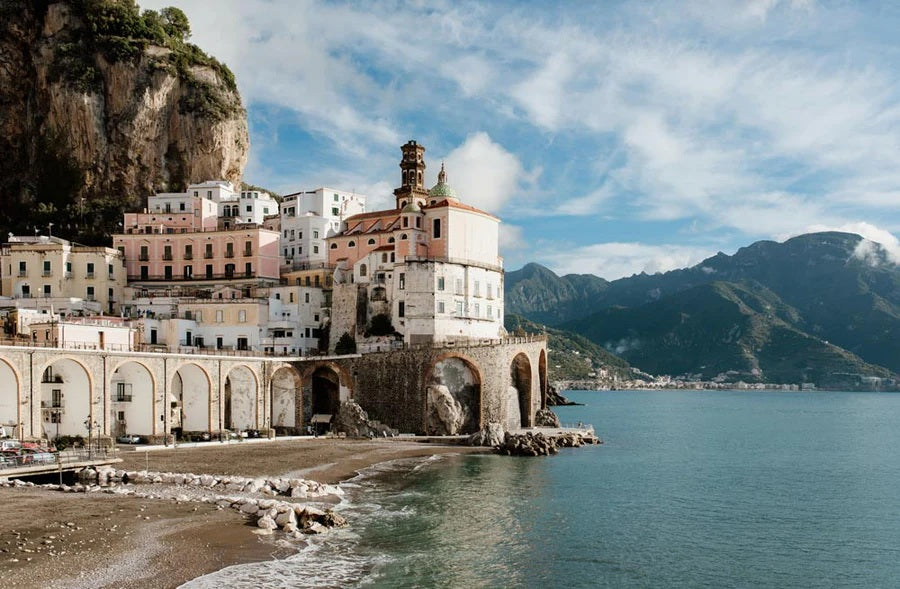 Immerse yourself in the timeless charm of Atrani, Italy’s hidden coastal gem, captured in warm sunlight and pastel hues.