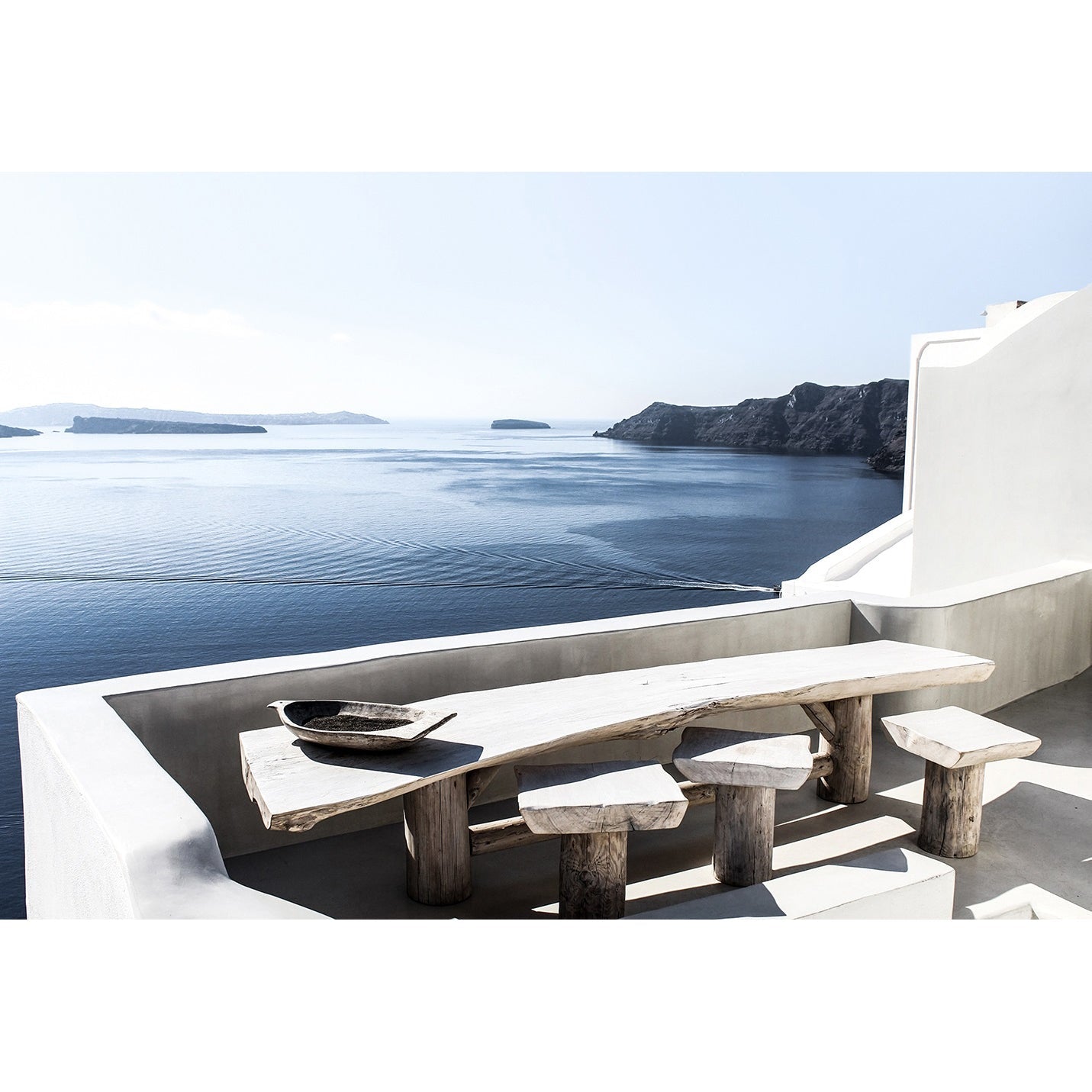 Set in a stylish Santorini seaside setting, the "Dining in Santorini" Coastal Art features a rustic furniture setting overlooking the spectacular views of the Santorini Coast in the Greek Islands.