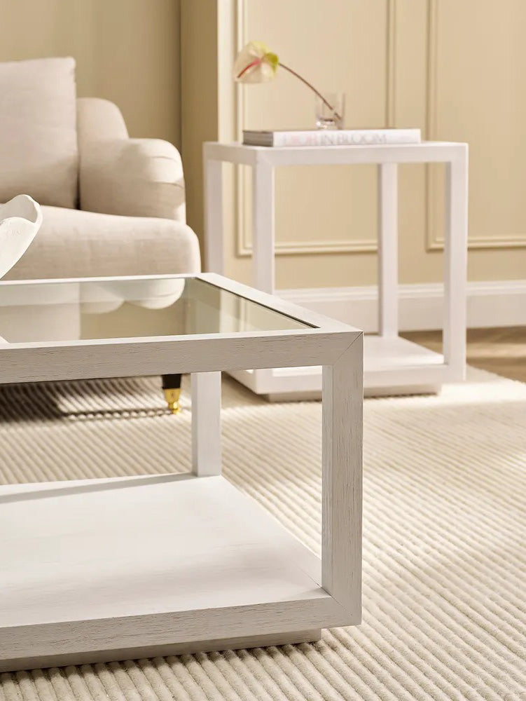 The Lugano Collection blends rich brushed oak and sleek tempered glass in a design that speaks to both modern elegance and timeless charm. The Lugano Square Coffee Table showcases a crisp white brushed oak frame paired with a clear glass top that opens up the room with light and clarity.