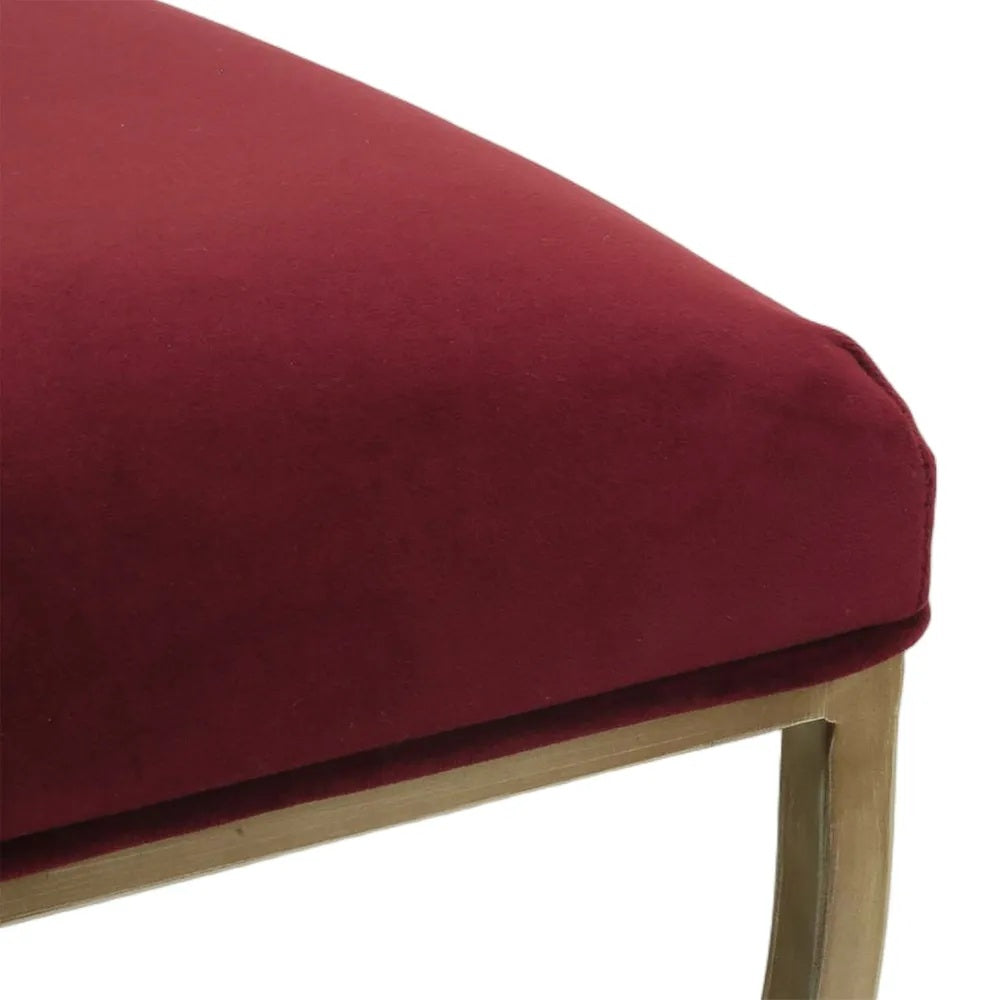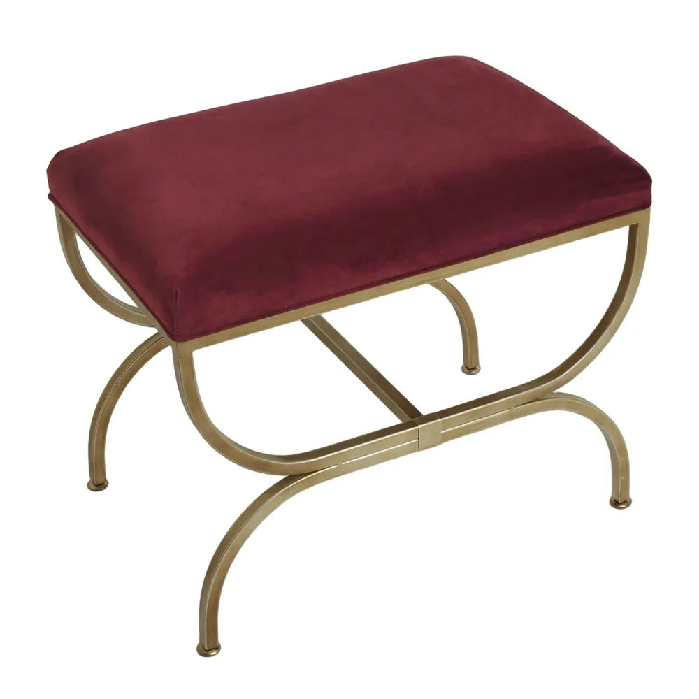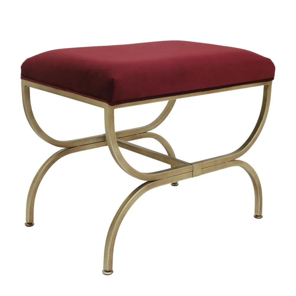The Novak Stool in mulberry velvet and antique gold blends sculptural elegance with refined upholstery to create a sleek, modern statement piece. Its softly arched antique gold base supports a plush, well-padded seat in rich wine red upholstery. Whether styled at a dressing table, placed in an entryway, or used as an occasional accent, the Novak stool delivers both beauty and everyday practicality. With its timeless silhouette and premium materials, it elevates classic and contemporary interiors alike.