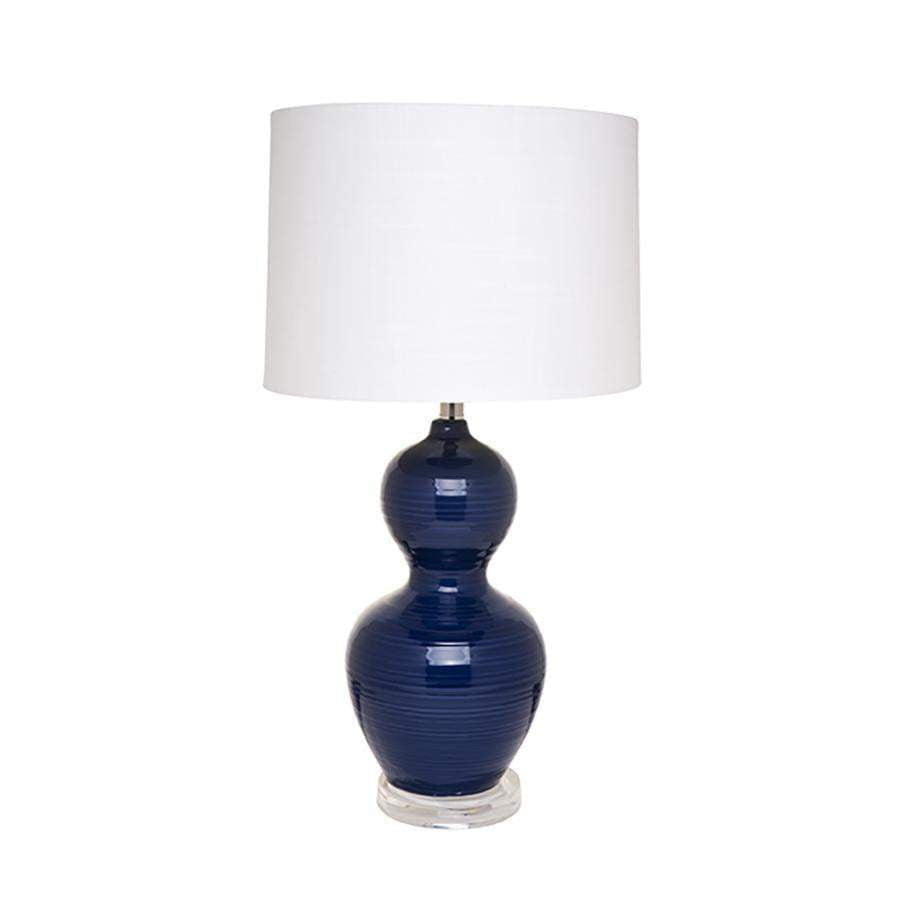 A classic nautical combination of crisp white and rich navy combine to stunning effect in our Bronte table lamp. Offering simple luxury, voluptuous curves make for a striking silhouette while the subtle ribbing on the navy glazed ceramic base offers delicate texture reminiscent of wave washed sands. Mounted into a clear acrylic base, the Bronte table lamp will set the scene of your contemporary coastal oasis. A soft to touch linen shade in pure white, ever so slightly tapered, completes the design.