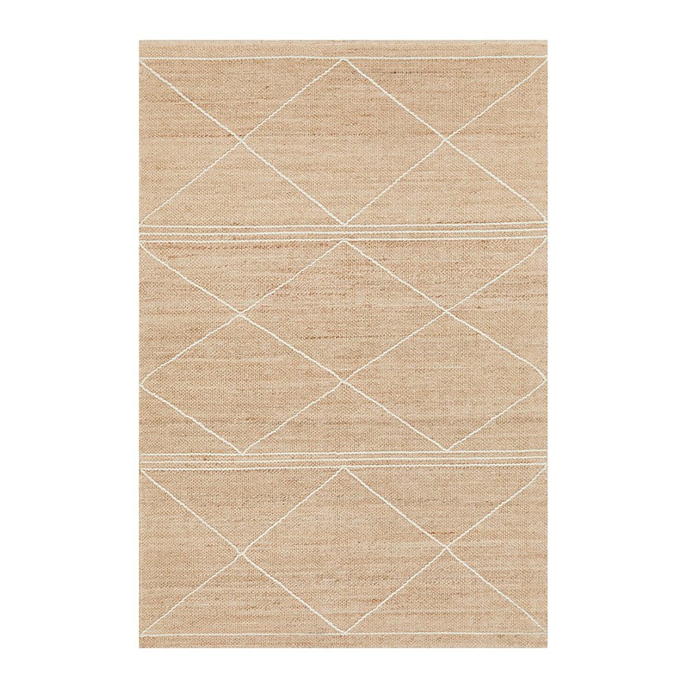Crafted with fabulous precision, the Darren Palmer Earth rug strikes an exquisite equilibrium between natural jute, cotton, and wool, embodying both a sense of grounding and a flair for style. This rug is a true ode to the beauty of natural elements, featuring an intricate white geometric pattern delicately set against a jute canvas.