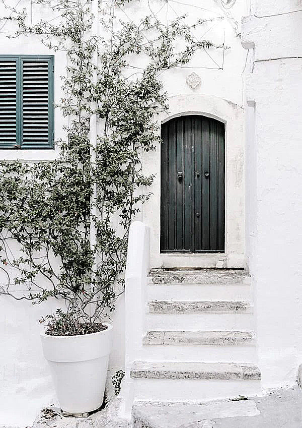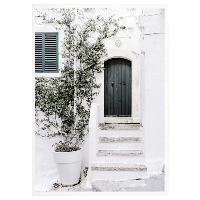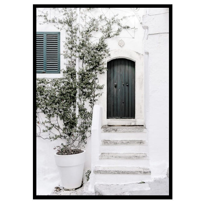 Capture the charm of Liguria with this stunning wall art featuring a beautiful black front door set against a crisp white building. The scene is completed with rustic stone stairs leading up to the entrance, embodying the timeless elegance of an Italian village. This piece brings a touch of Mediterranean allure and architectural beauty to any space.