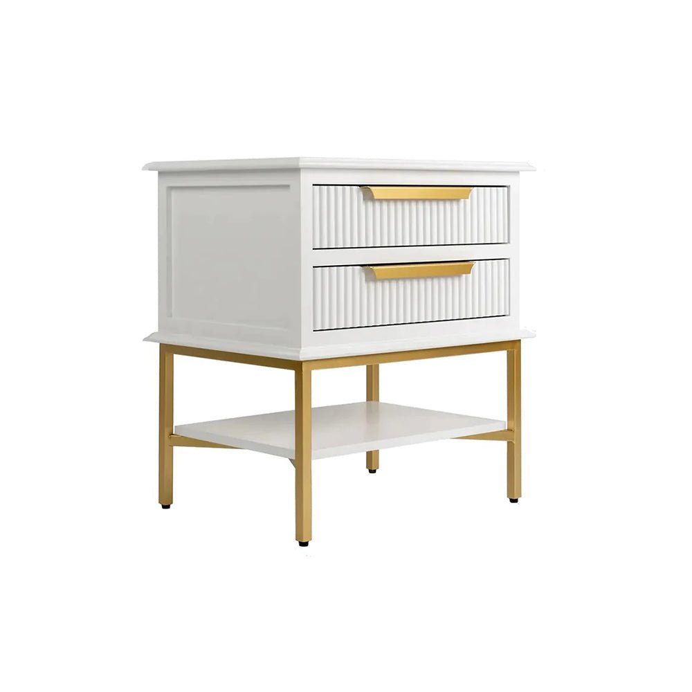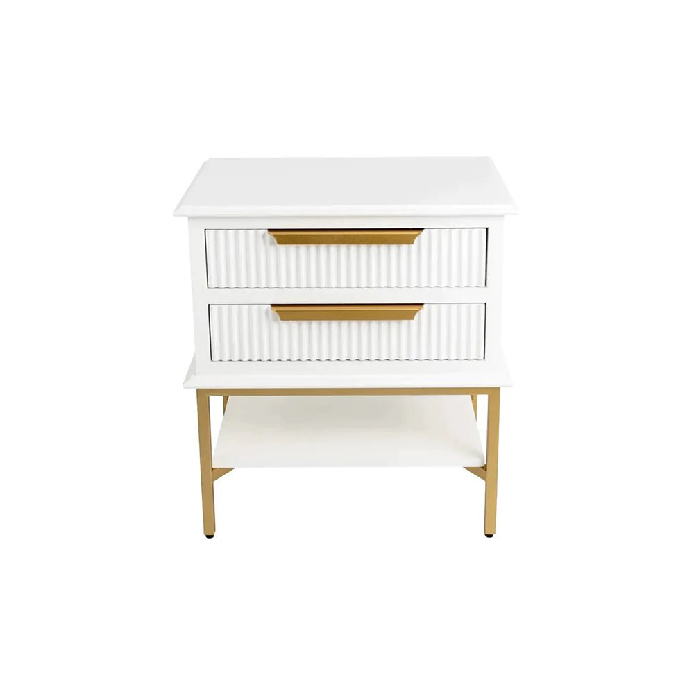 The Ripple bedside table (small) adds an illustrious touch of modern glamour to your sophisticated abode. The elegant metal frame of the Ripple Bedside Table is reminiscent of the plush interiors in Parisian homes, while its two ribbed-front drawers and bonus shelf offer discreet storage with regal grandeur - perfect for tucking all those chic little things away!