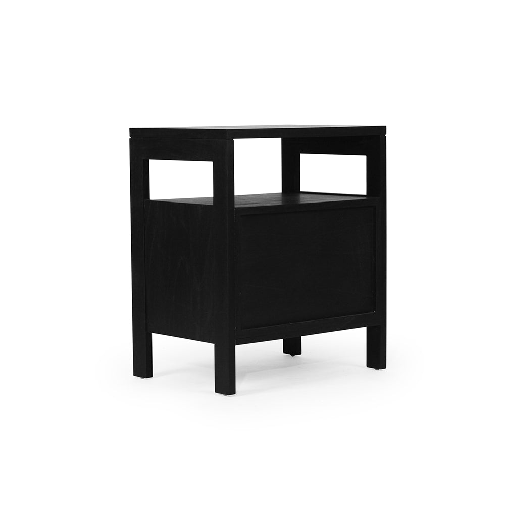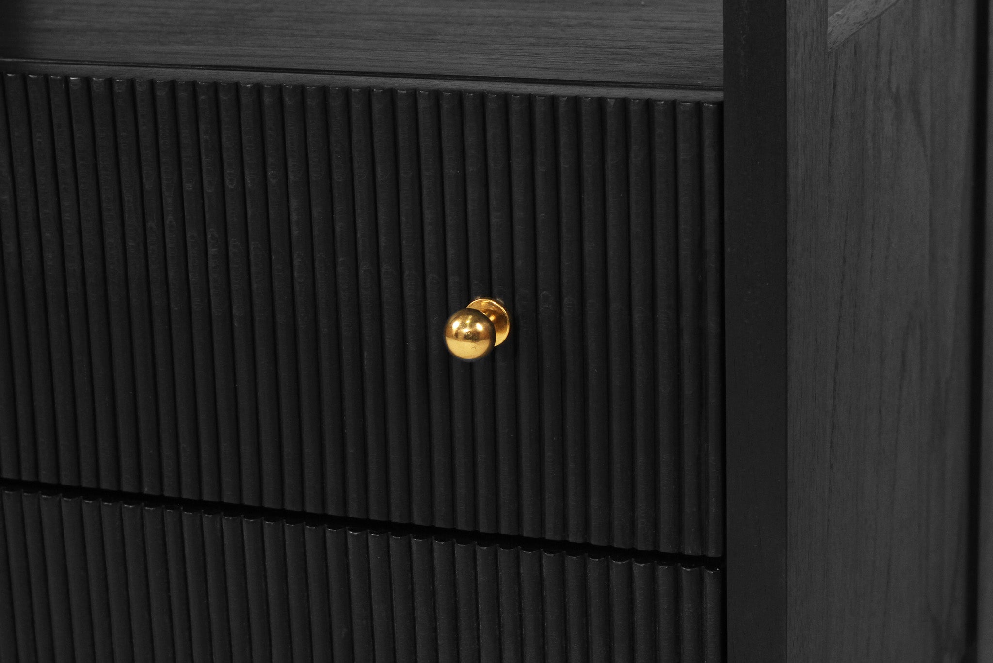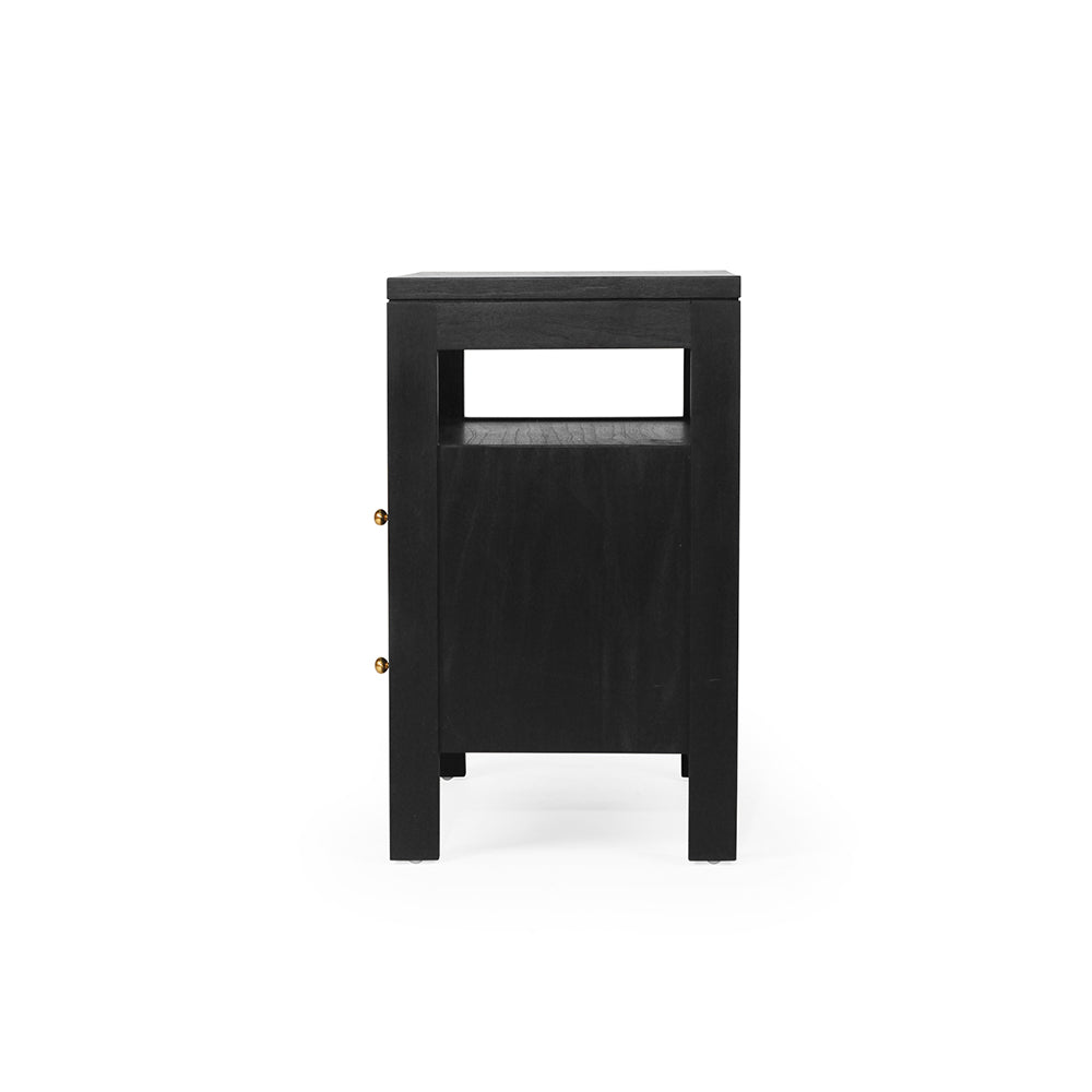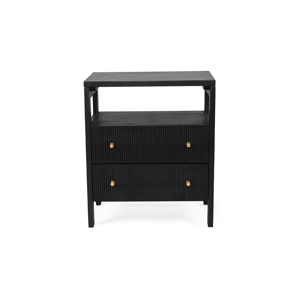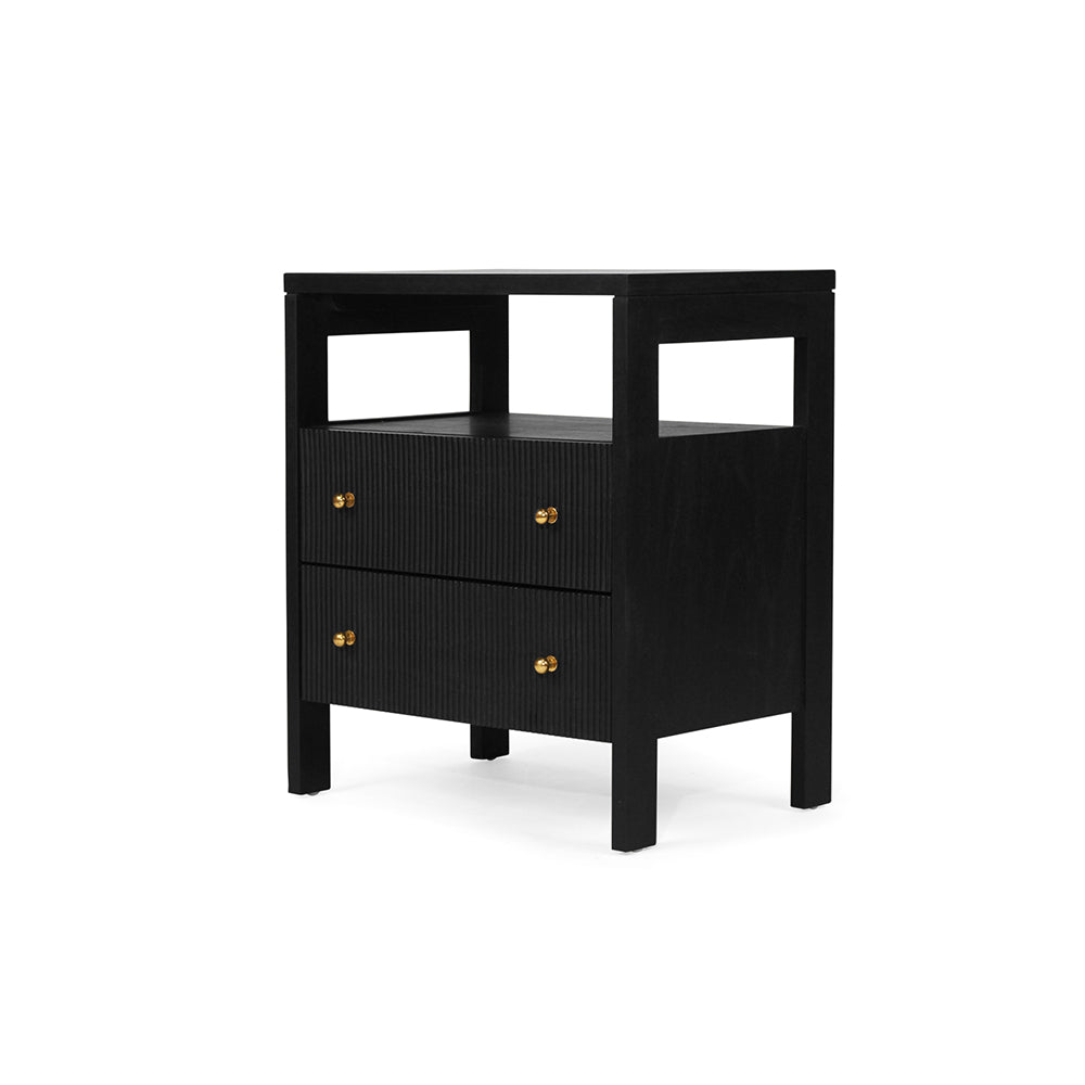 The Taylor Black Bedside Table is hand-crafted from solid teak with a stained black finish and brass knobs. Featuring fluted drawer fronts, two spacious drawers, and an open shelf, this luxe black bedside table blends timeless style with practical storage for modern or coastal interiors.