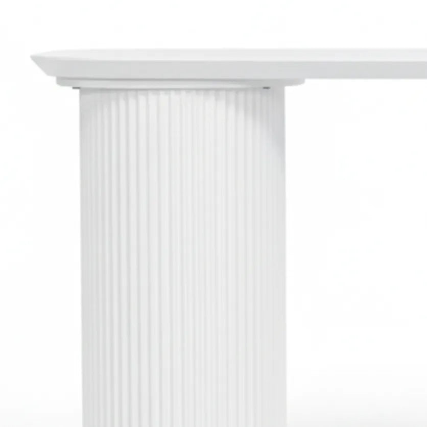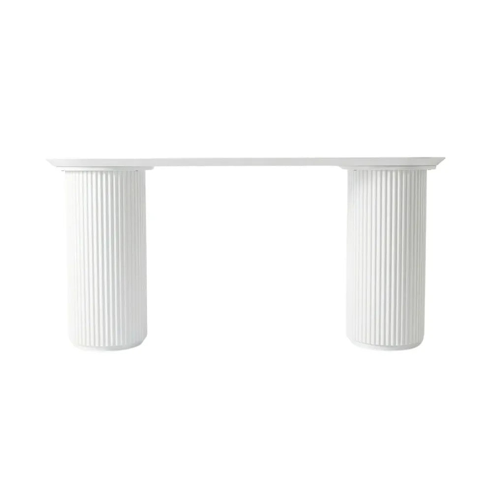 The Monaco Large Console Table in white architecture with attitude - sculptural fluted pedestals and a refined oval silhouette, bold & beautiful. Style it in an entryway, living room, or behind a sofa with statement lighting, art books, and curated objects. Available in two sizes and finished in black, antique gold, or white for effortless versatility. Also Available in Black and Antique Gold.