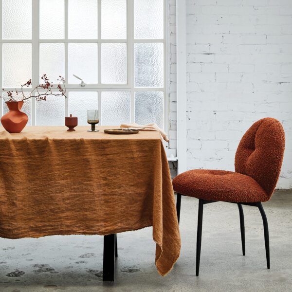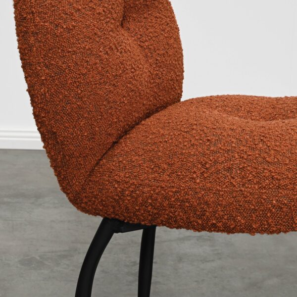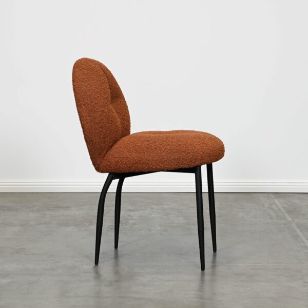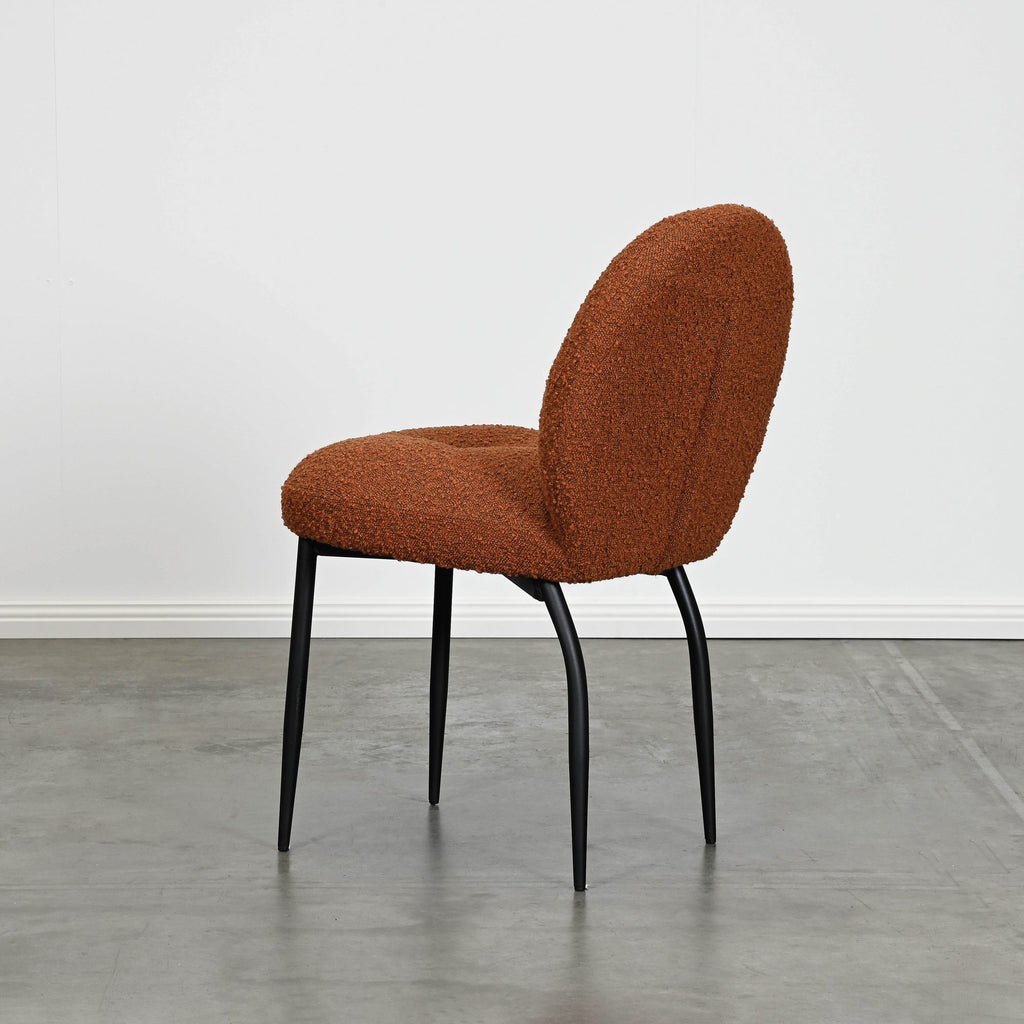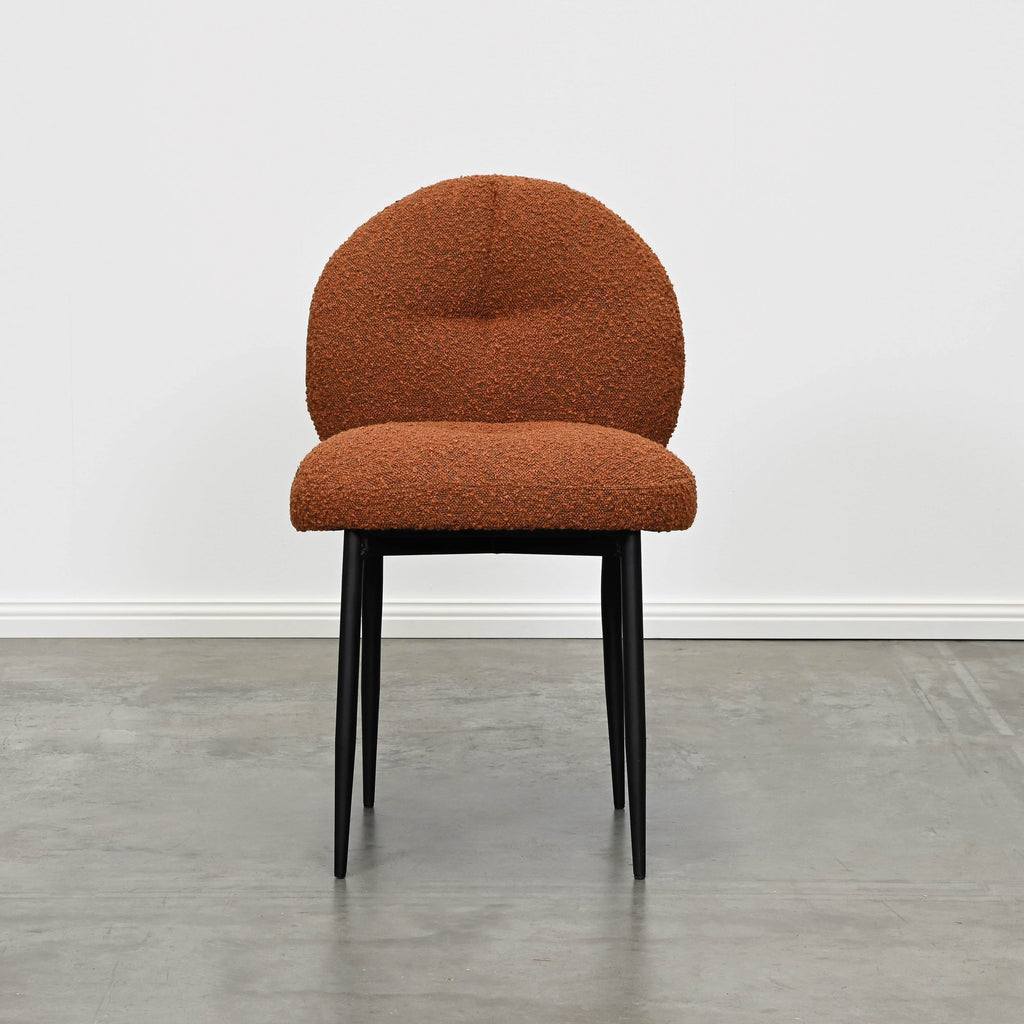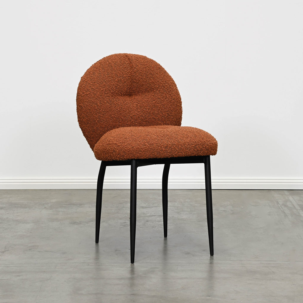 The Como Dining Chair perfectly balances style and functionality with its sleek, rounded design. Available in a variety of richly upholstered fabrics, it features a designer brick red boucle that adds a bold touch to any dining space. Supported by durable and elegant black metal legs, this chair combines contemporary elegance with lasting comfort, making it an ideal choice for those seeking a statement piece in their dining area.