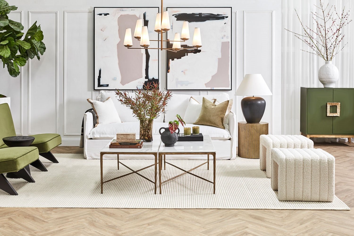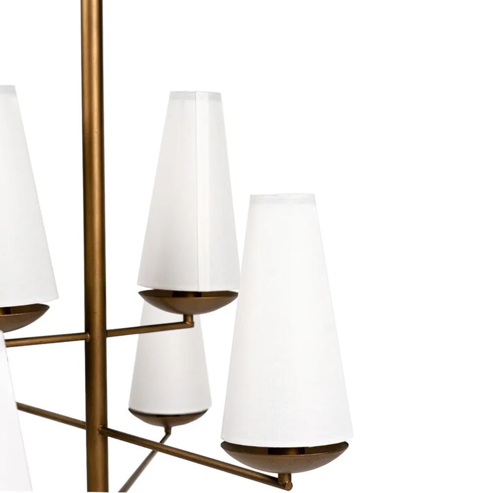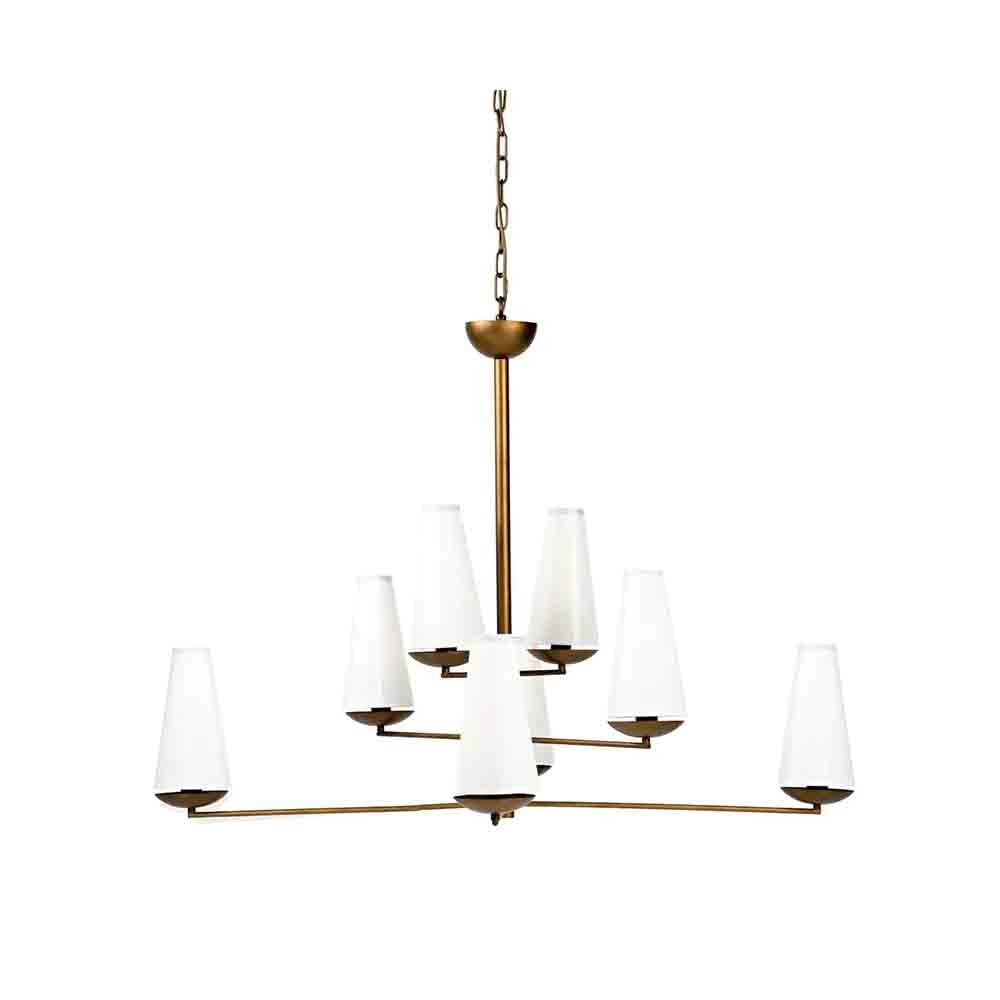 The modernist appeal of the Esther chandelier lends itself to both classic and contemporary interiors. Simple, clean-line geometric shapes intersect in a layered, offset formation, resulting in a piece that is understated yet intriguing. Constructed from a tubular iron frame in an elegant antique gold painted finish, the Esther chandelier measures 114cm diameter and features 8 tapered lamp shades that hover lightly above an antique gold bowl, omitting a warm, defused glow.