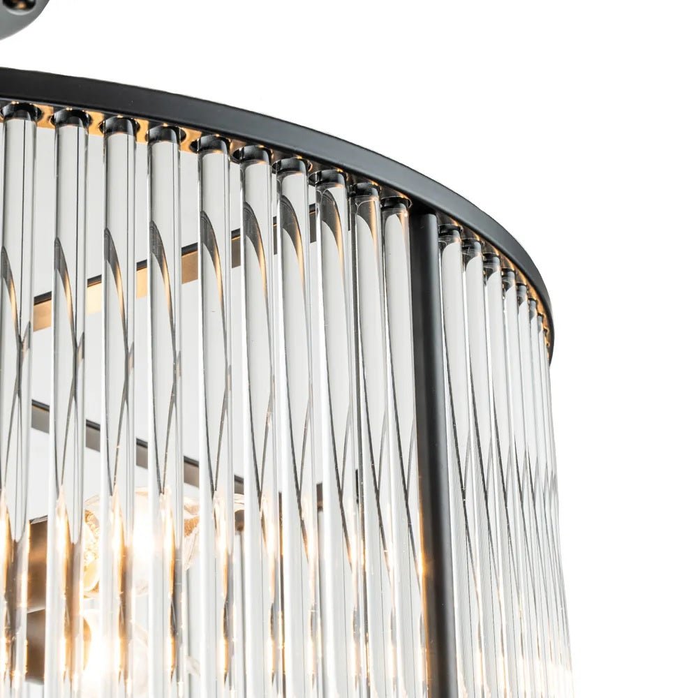 Experience refined opulence with the Viva Flush Mount. Its captivating rounded shade, embraced by a stylish black finished metal frame, unveils a captivating arrangement of cylindrical glass rods. A contemporary inspiration resonates in this fixture, crafting an exclusive statement ideal for low ceilings or poised above a chic dining setting. Emanate an aura of sophistication with its radiant glow.