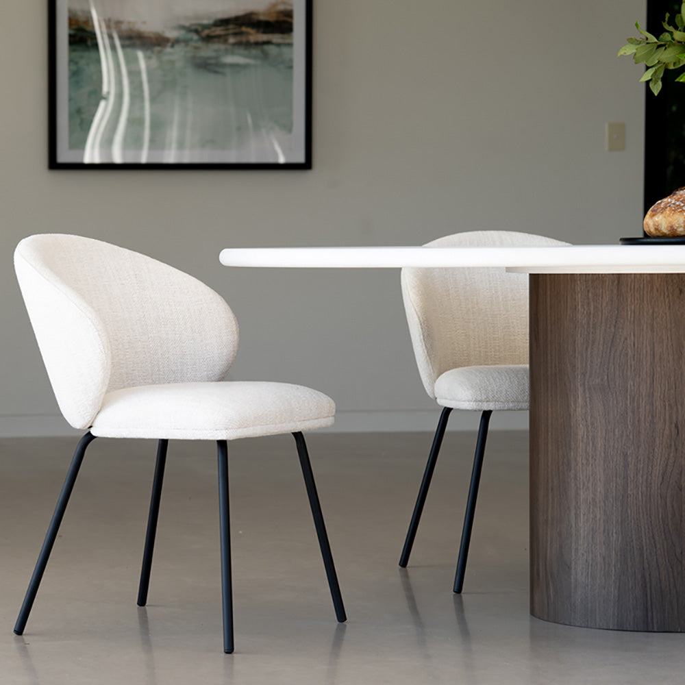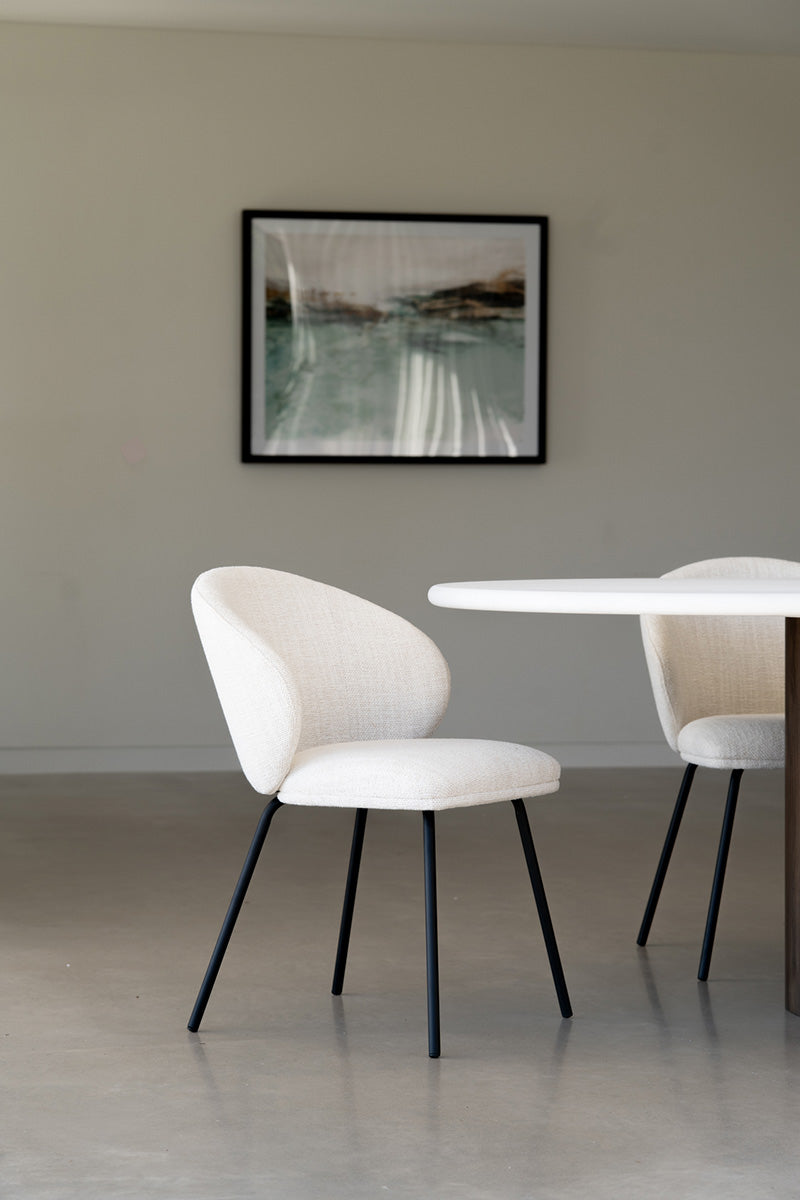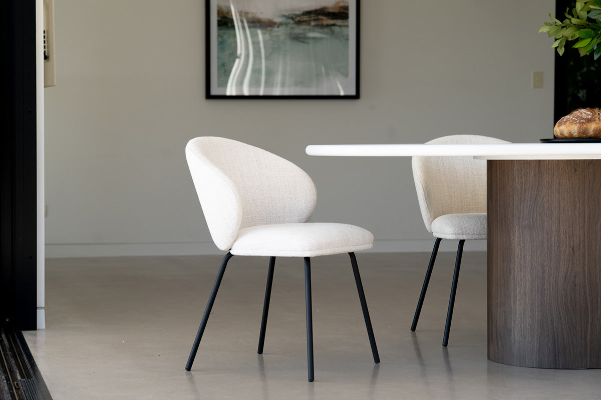 Sleek, sculptural, and supremely comfortable, the Coco Dining Chair is designed to elevate every dining moment. A generously padded seat and back in a natural-toned upholstery offer everyday ease, while the slim, black powder-coated steel frame provides strength with a refined silhouette. Versatile and effortlessly modern, the Coco Dining Chair brings lasting style and substance to any contemporary setting.
