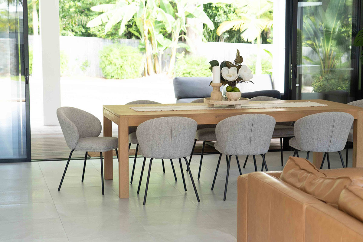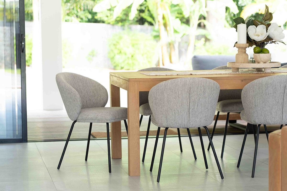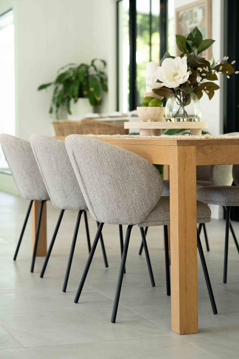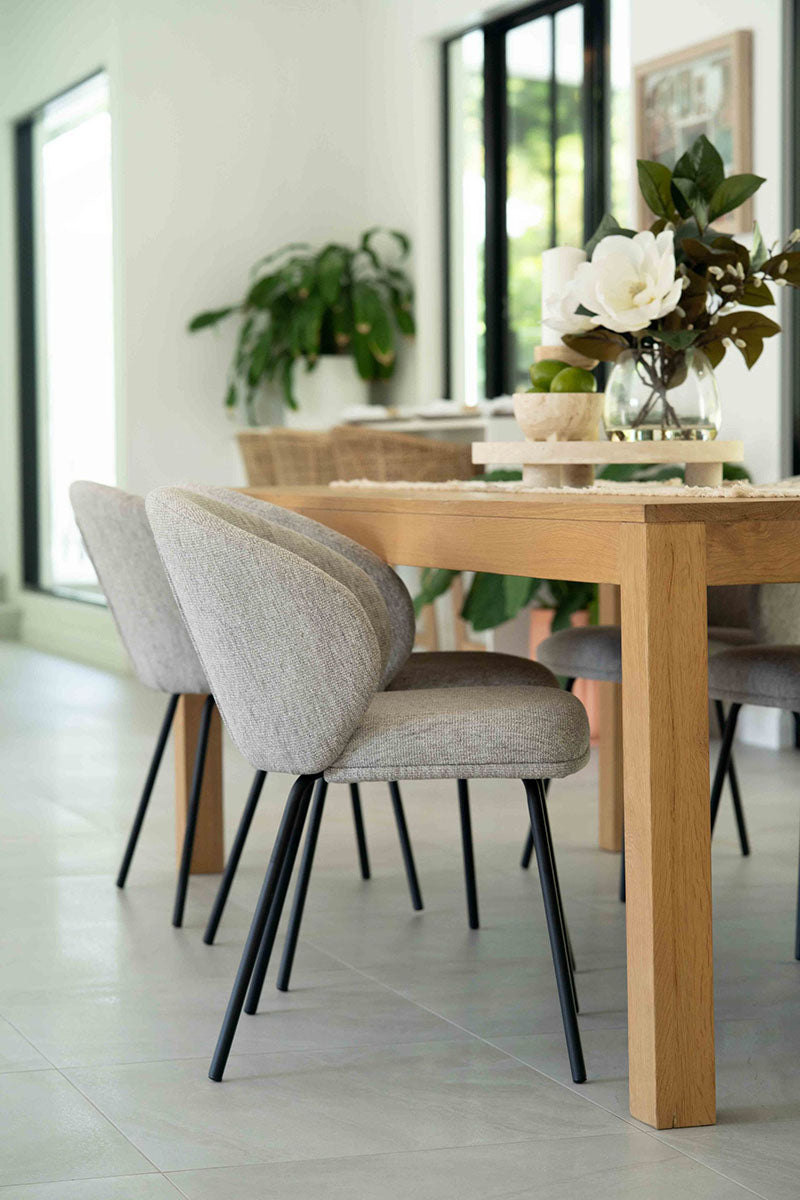 Sleek, sculptural, and supremely comfortable,  the Coco Dining Chair in pebble is designed to elevate every dining moment. A generously padded seat and back in a pebble-toned upholstery offer everyday ease, while the slim, black powder-coated steel frame provides strength with a refined silhouette. Versatile and effortlessly modern, the Coco Dining Chair brings lasting style and substance to any contemporary setting.