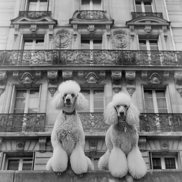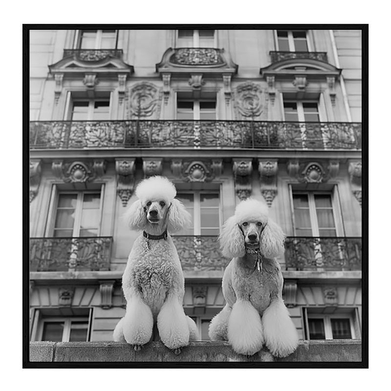 Elevate your space with chic Parisian flair. This black and white "French Poodles" print captures timeless elegance—two poised poodles, a classic French backdrop, pure sophistication for your walls.
