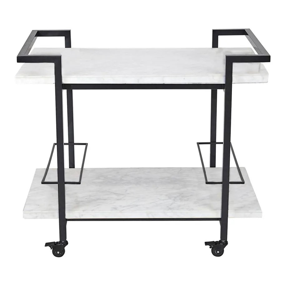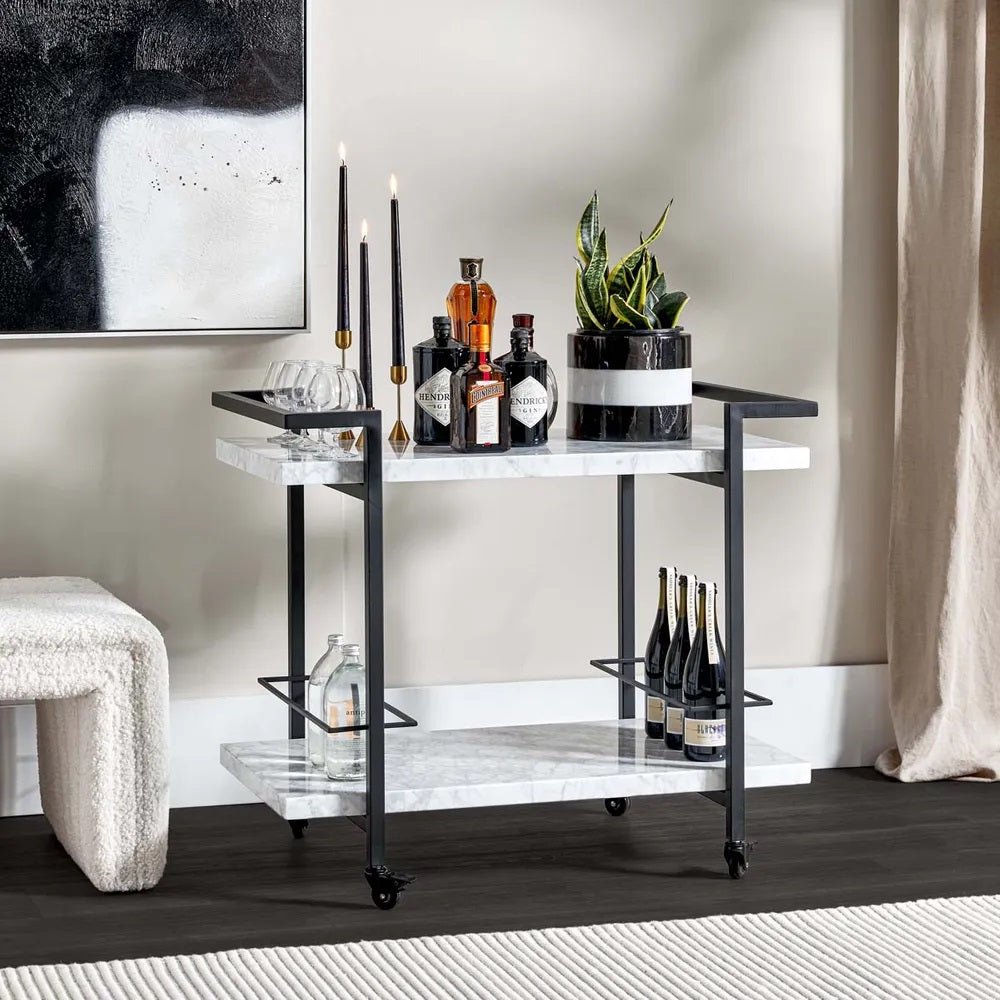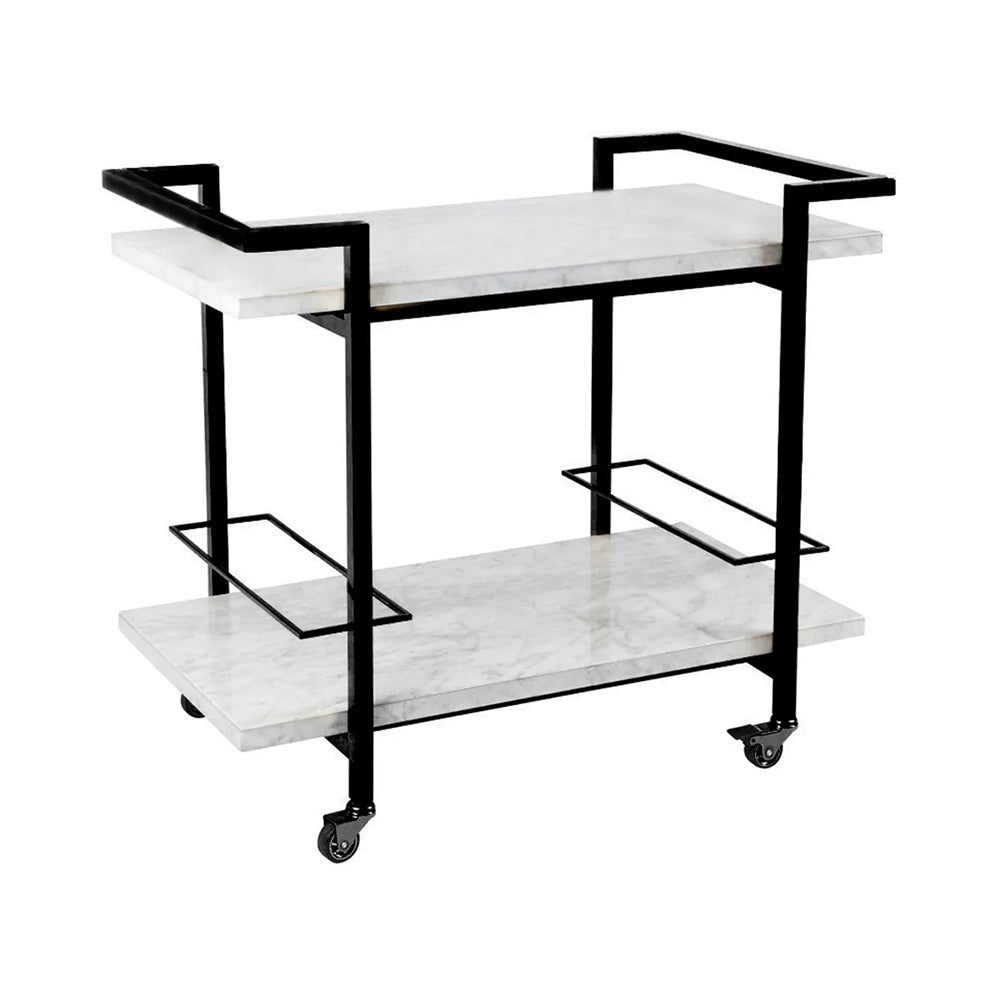 Bring wow-factor to your Home Bar with the Versatile and multi-functional Madison Drinks Trolley in white marble. This art deco styled drinks trolley has a black stainless steel frame with a white marble top and bottom shelves and is complete with stainless steel lock castors.