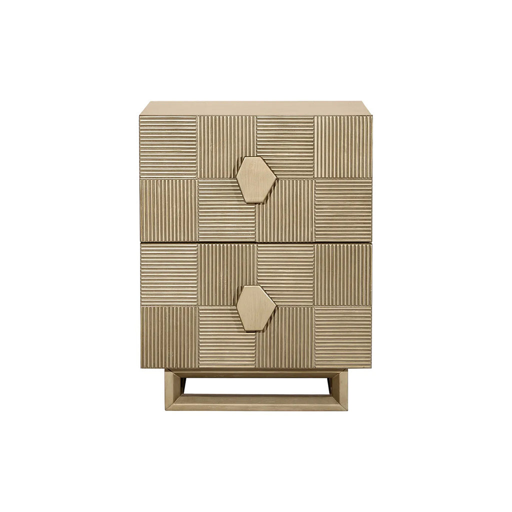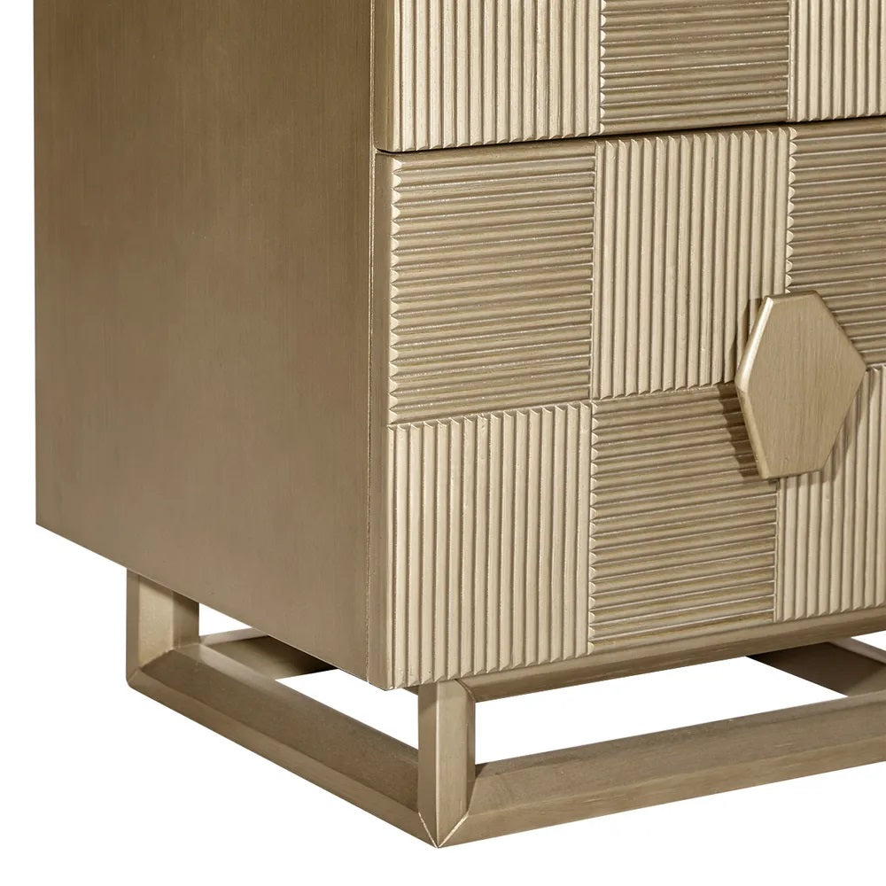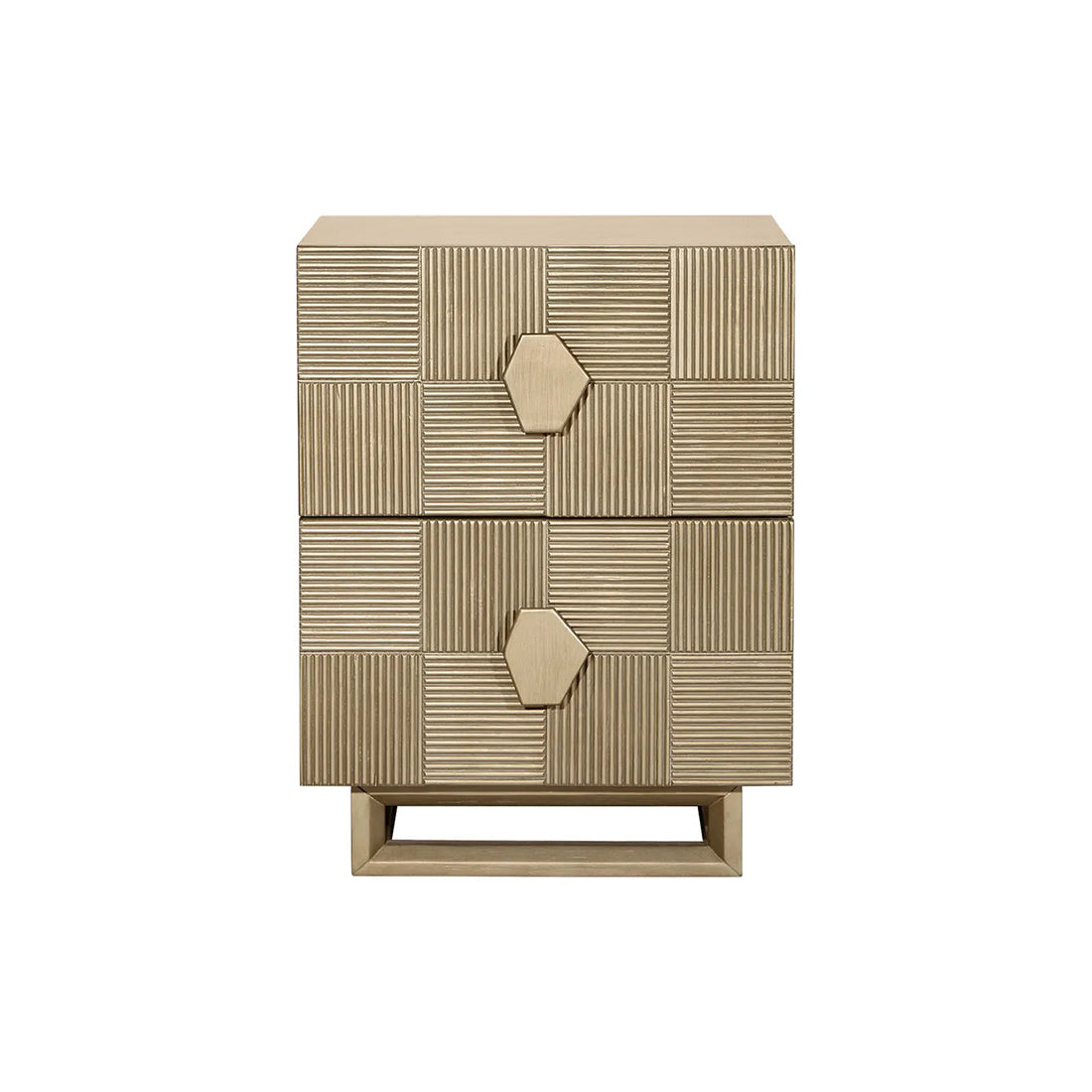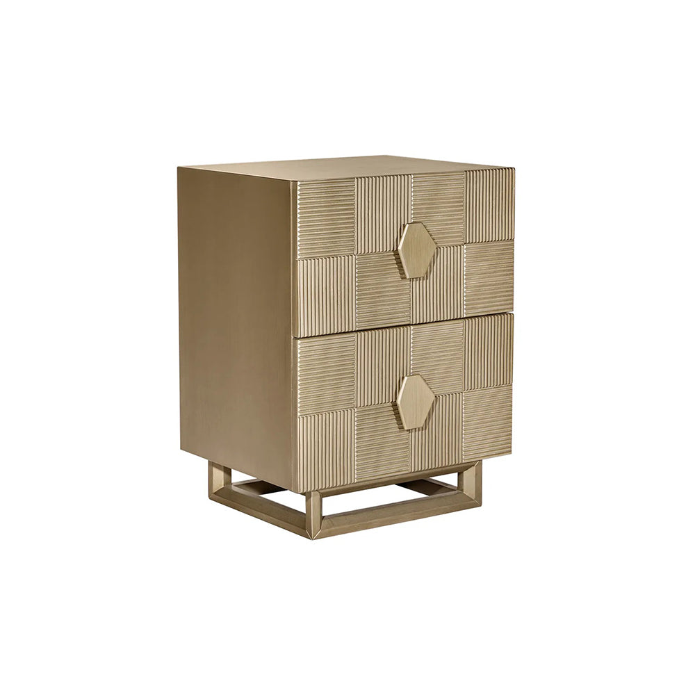 Elevate your bedroom with the Astoria Bedside Table - Small Antique Gold, a stunning two-drawer bedside Table. Crafted with an elegant brushed gold finish and intricate geometric detailing, this piece blends luxury and practicality. Spacious drawers offer convenient storage, while the sturdy open base provides visual balance, making it perfect for contemporary interiors.