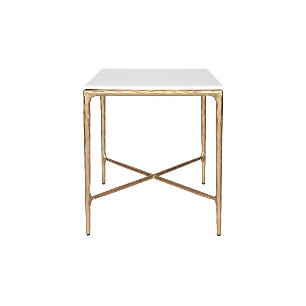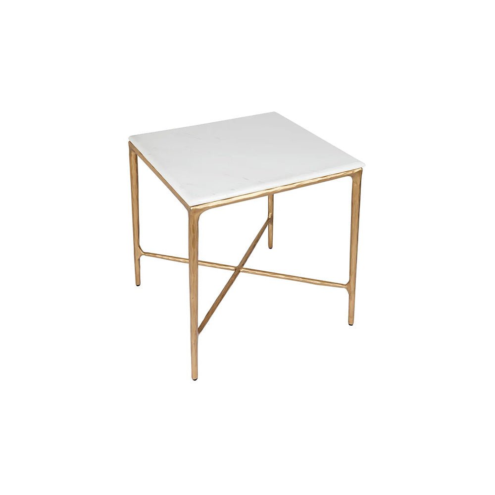 Elevate your space with the Heston side table, blending a hand-forged iron frame and Greek white marble for timeless elegance. Its sleek silhouette offers versatility, while the brass finish adds a glamorous gold touch. Artisan-crafted for unique texture, this gold look side table is ideal alone or paired in living areas and bedrooms.