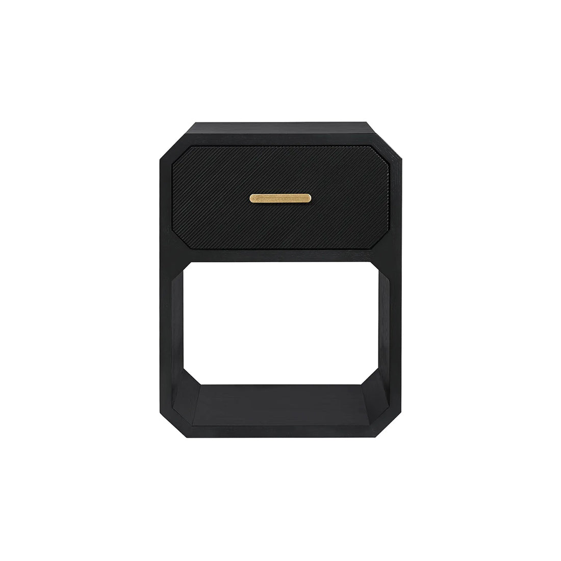 The Cooper Bedside Table in black pairs ashwood veneer with a deep black painted finish - its bold, angular silhouette exudes pure architectural elegance. A single drawer, etched with subtle diagonal texturing, glides with precision, accented by a brushed gold handle. Below, an open shelf balances form with function, while the radiant finish delivers a hit of pure, polished decadence. Also available in antique gold or white and in larger sizes.