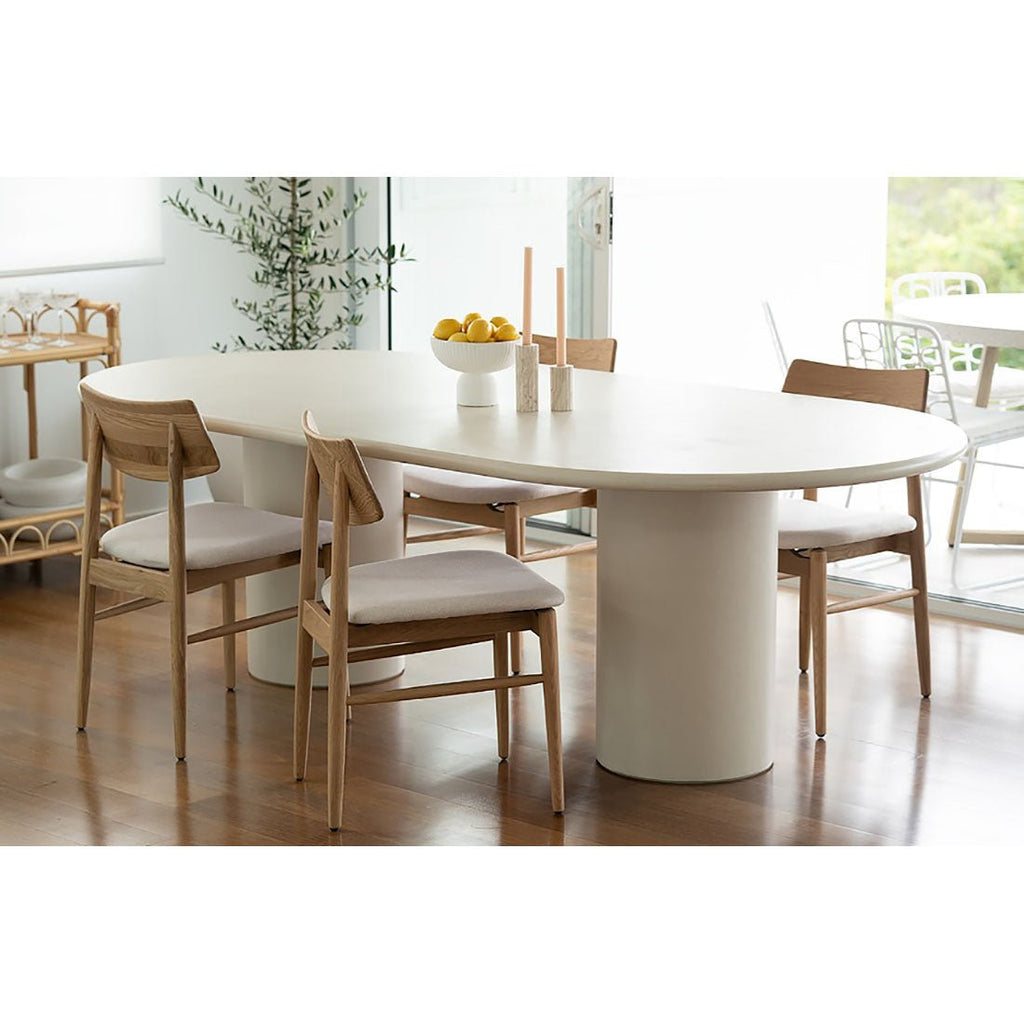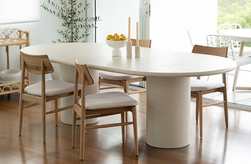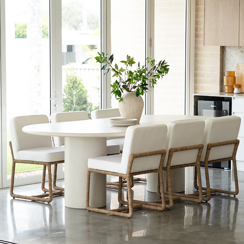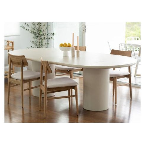 Discover the Piato 2.4m Dining Table, an epitome of elegance and contemporary design. Crafted with a classic oval shape, this table boasts an exquisite off-white "latte" finish, creating a refined aesthetic. Resting on a sturdy pedestal base, it comfortably seats eight, making it ideal for gatherings. Perfectly suited for both intimate family dinners and stylish entertaining in open plan living areas, the Piato enhances any space with its graceful presence and functional sophistication.