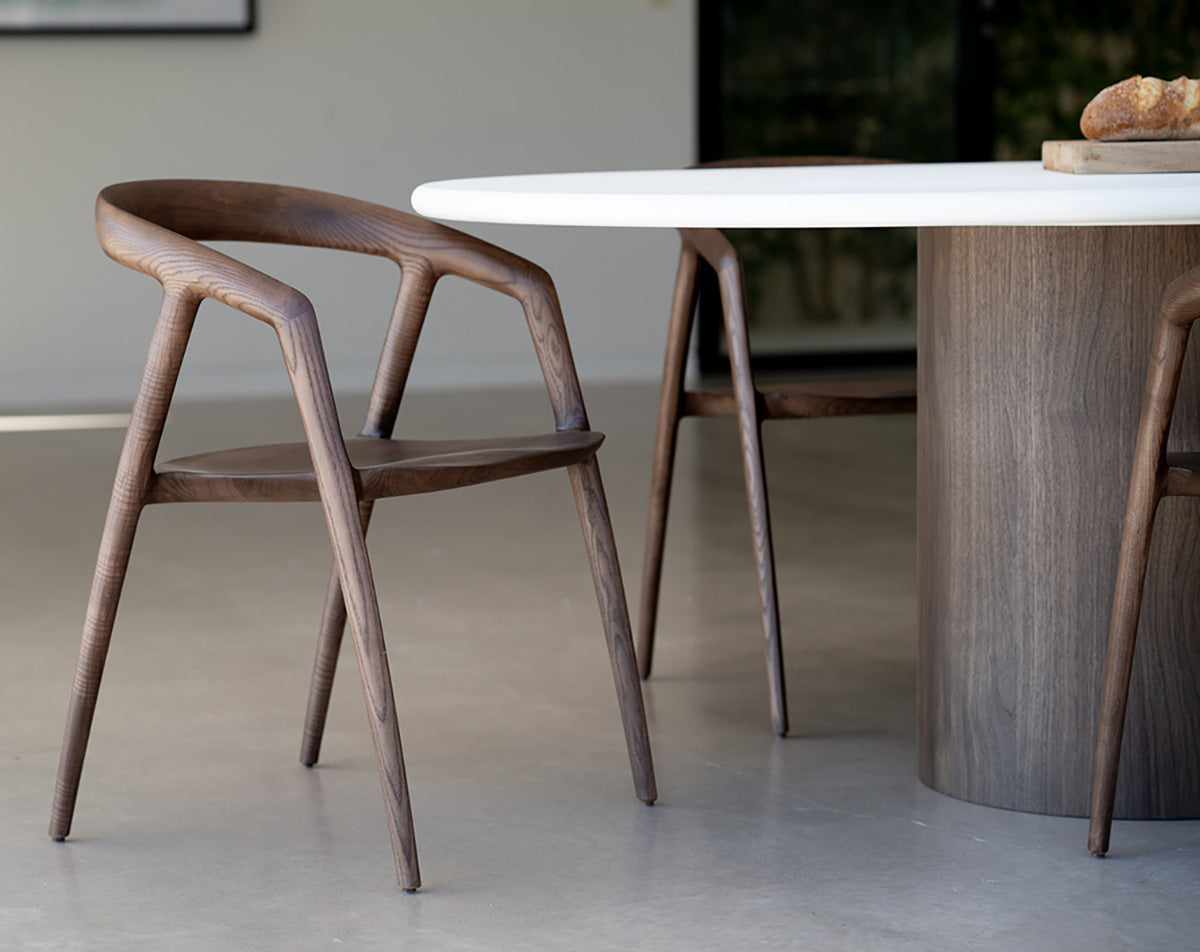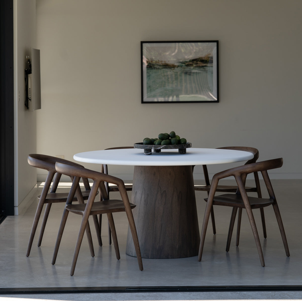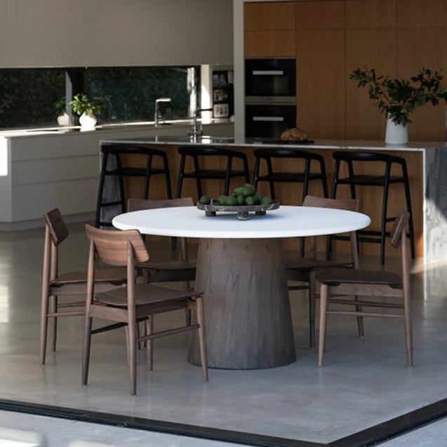 Understated elegance meets everyday comfort in the Sonoma Dining Table. Featuring a smooth white micro cement top set on a beautifully tapered walnut veneer base, this sculptural piece blends organic warmth with refined modern style. The softly rounded silhouette invites relaxed conversation, making it the perfect table to gather around for a home-cooked meal or long, leisurely dinner. Designed for both contemporary and timeless interiors, the Sonoma is where simplicity and sophistication meet.