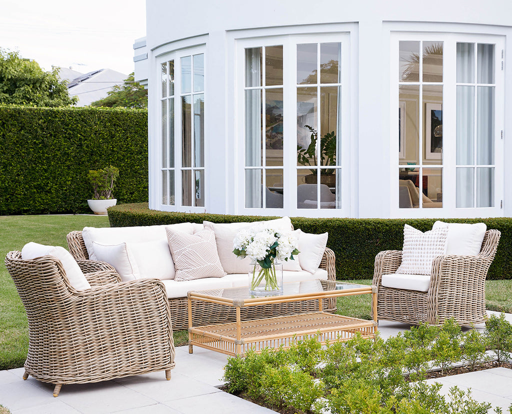 Our Sardinia outdoor coffee and side tables are crafted from aluminium and synthetic rattan, designed for durability in outdoor settings. The frame is hand-painted to mimic natural rattan, then powder-coated and lacquered to resist rust and fading. The "Beech Teak" finish seamlessly coordinates with other natural finishes in the outdoor collection.