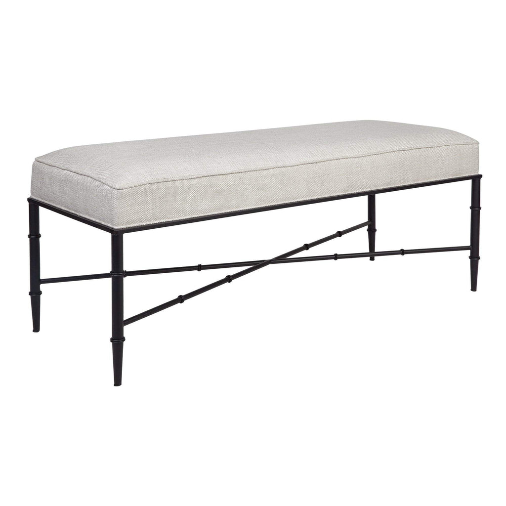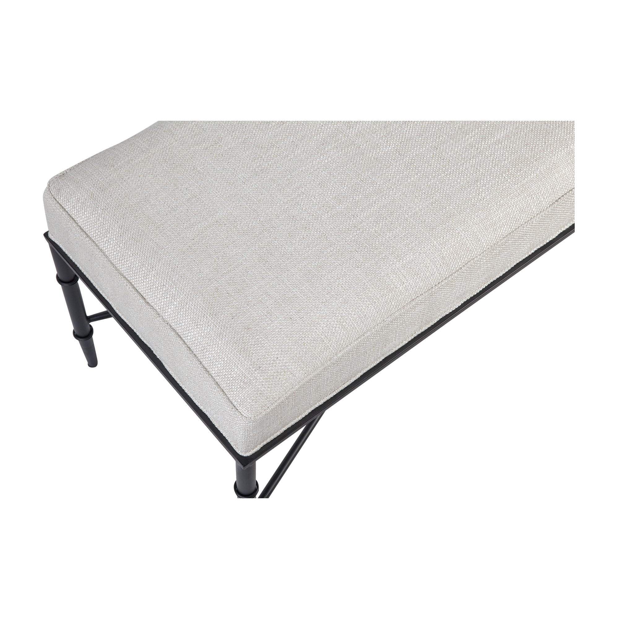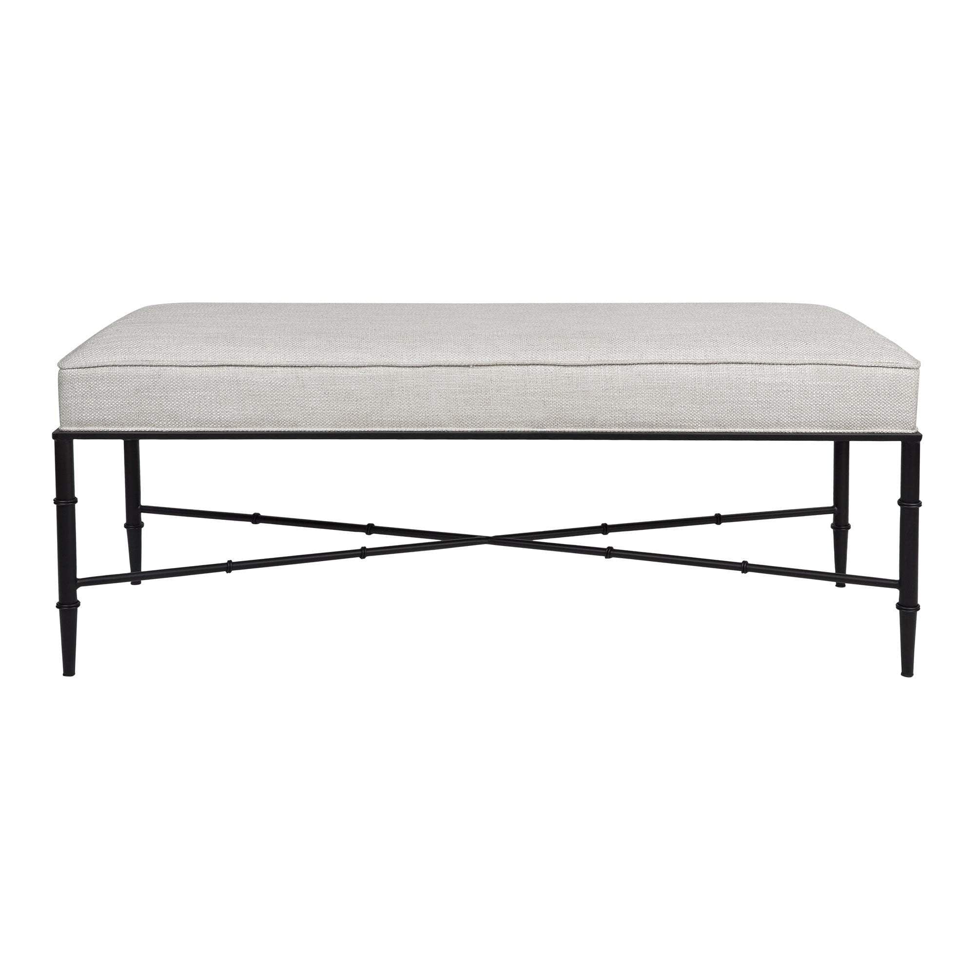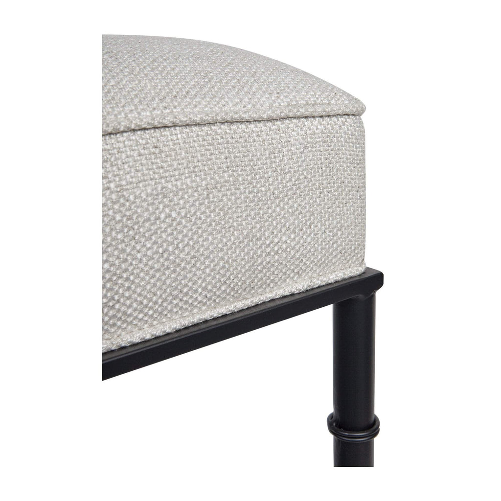 This versatile ottoman features stunning banded bamboo-inspired iron legs in a matt black finish. Its natural linen blend cushioned top adds classic texture while the tailored self-piping finish complements its refined look.