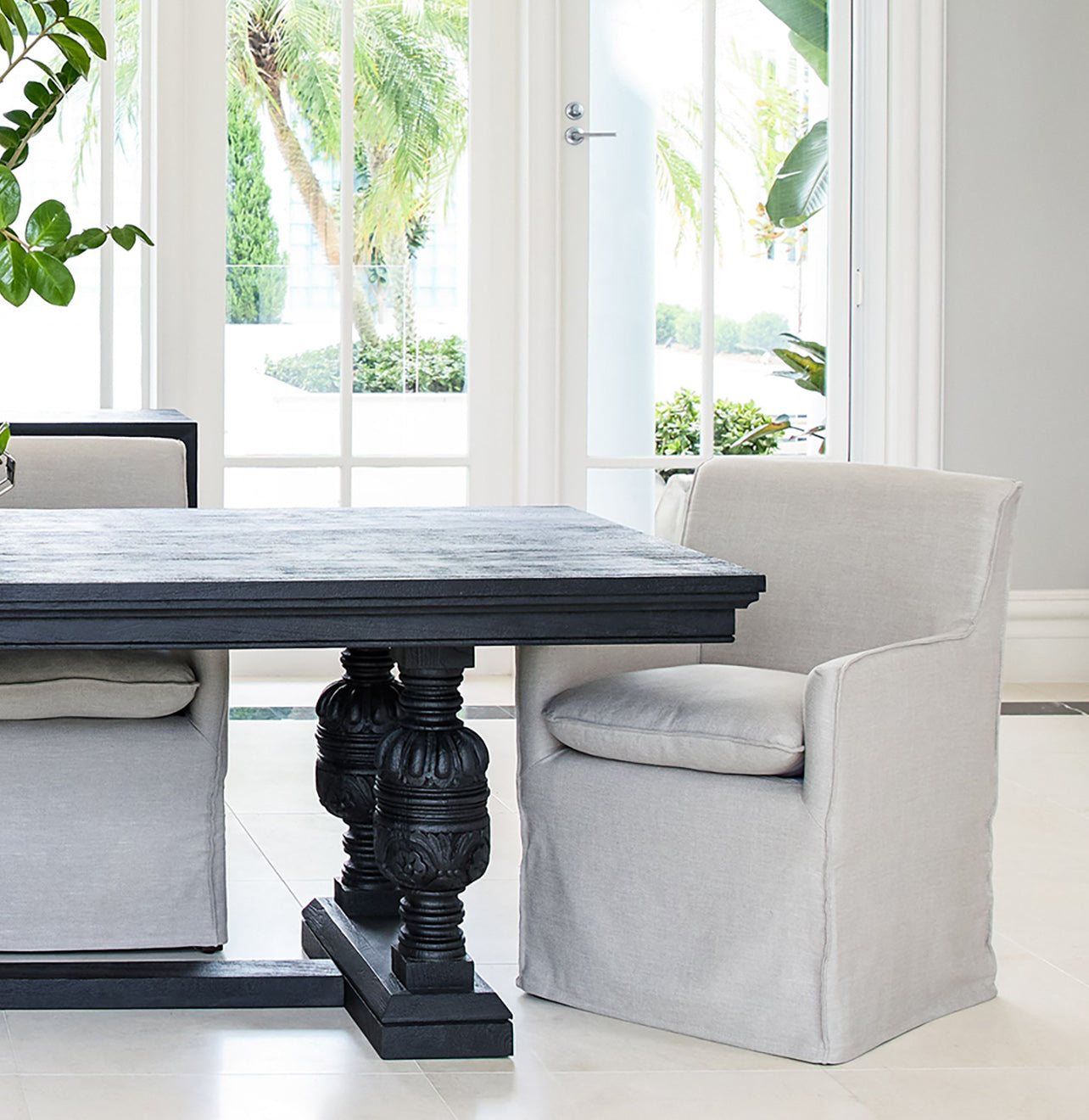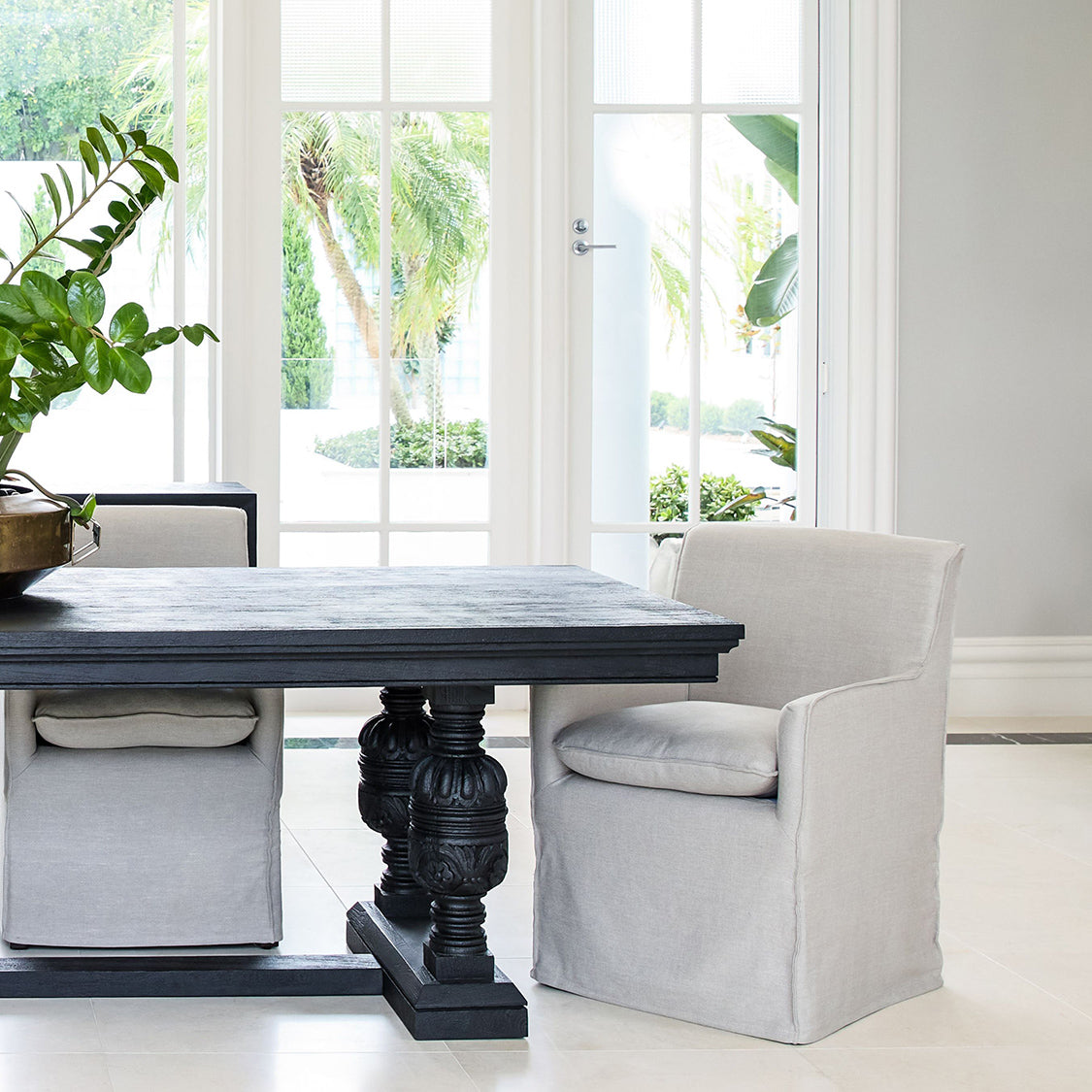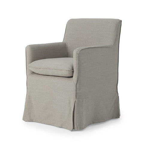 The clean lines, tailored skirt, and soft neutral upholstery give the Milos Dining Chair a refined yet approachable feel. The loose cushion seat and subtle arm slope make it comfortable and versatile, perfect for blending into coastal, modern farmhouse, Hamptons, or transitional dining rooms.