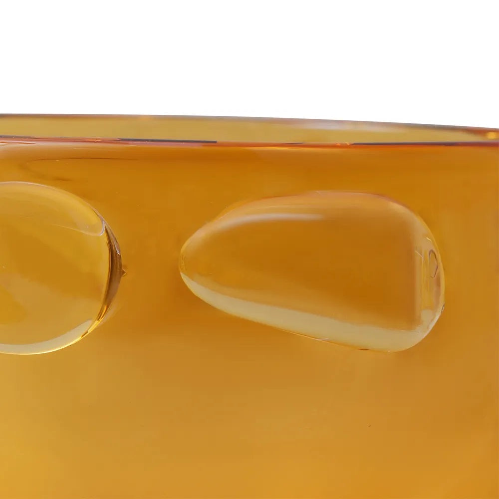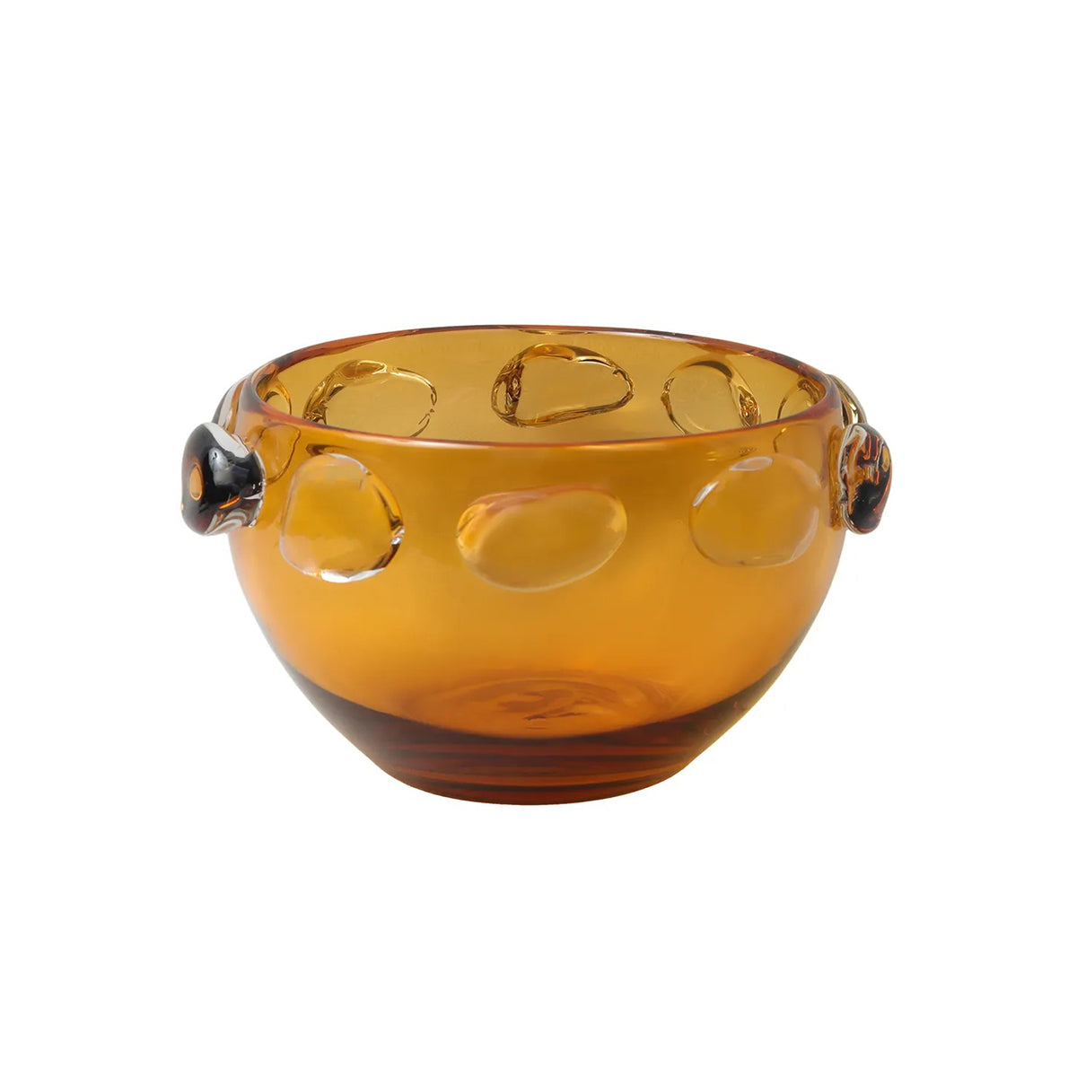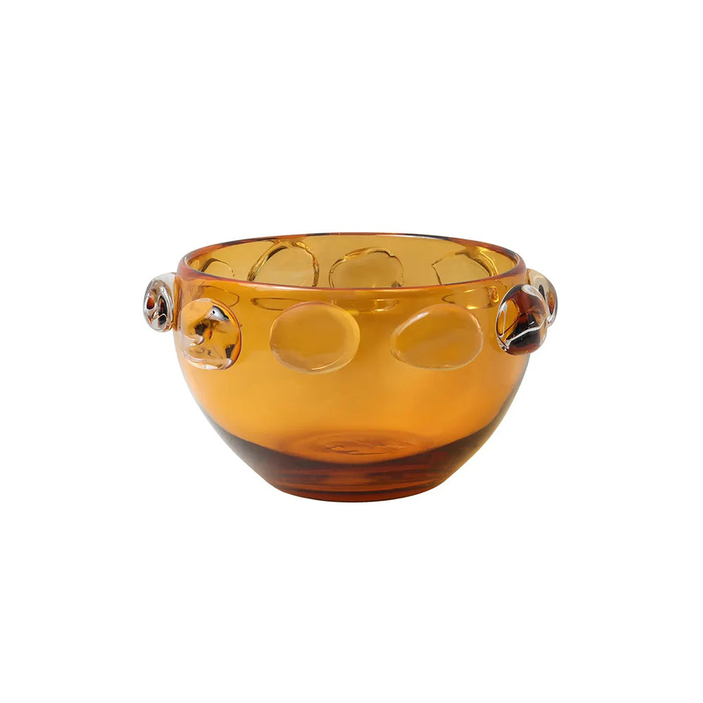 Discover the allure of timeless elegance with this exquisite amber glass bowl, a true testament to artisanal craftsmanship. Its smooth, handblown form is adorned with distinctive raised circular accents, creating a captivating interplay of depth and texture. Whether gracing your space as a centrepiece, showcasing fruits, or displaying decorative items, this bowl seamlessly blends functionality with artistic sophistication.