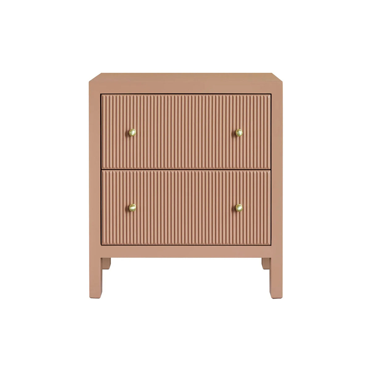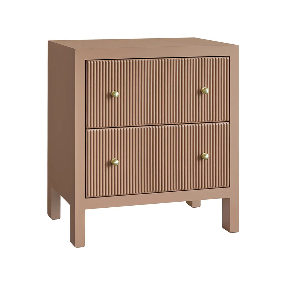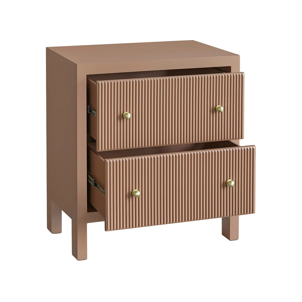 The Adele Bedside Table Large Mocha Mousse radiates warmth and luxury in a rich mocha hue inspired by Pantone’s 2025 Colour of the Year. Its refined silhouette sits on slender legs, with two fluted drawers on smooth metal runners, finished with elegant gold knobs—timeless, compact, and effortlessly stylish.