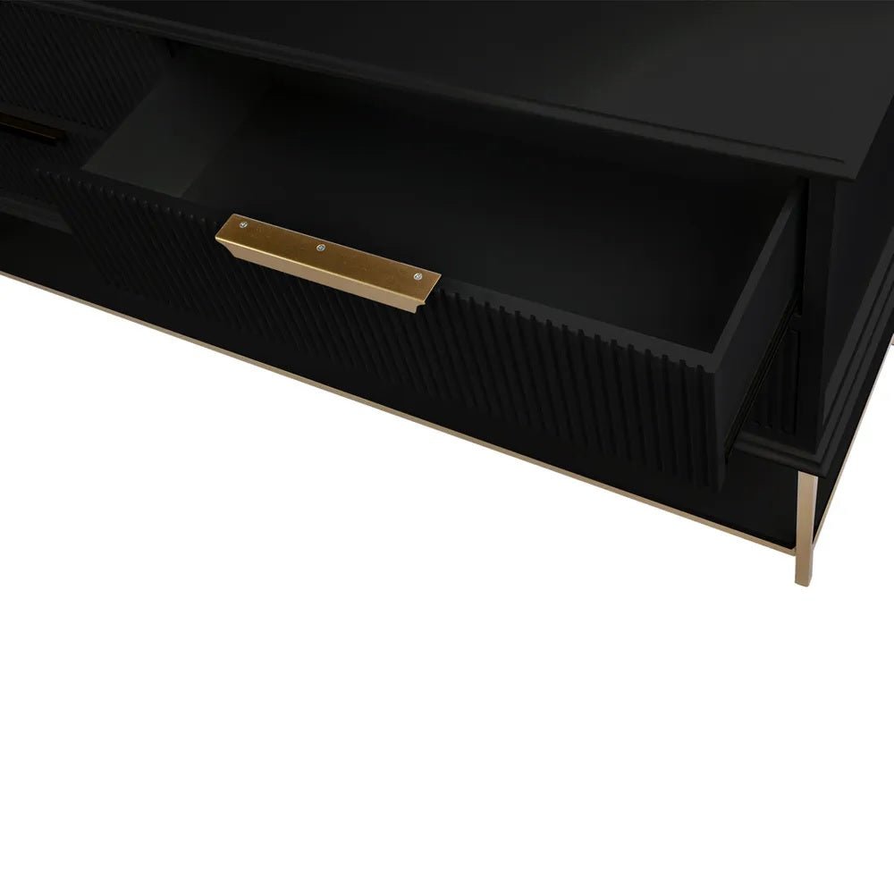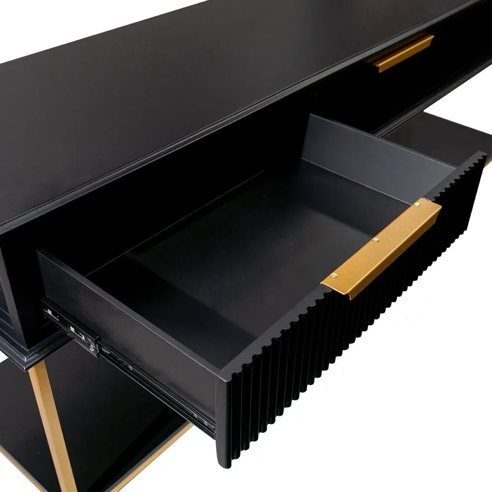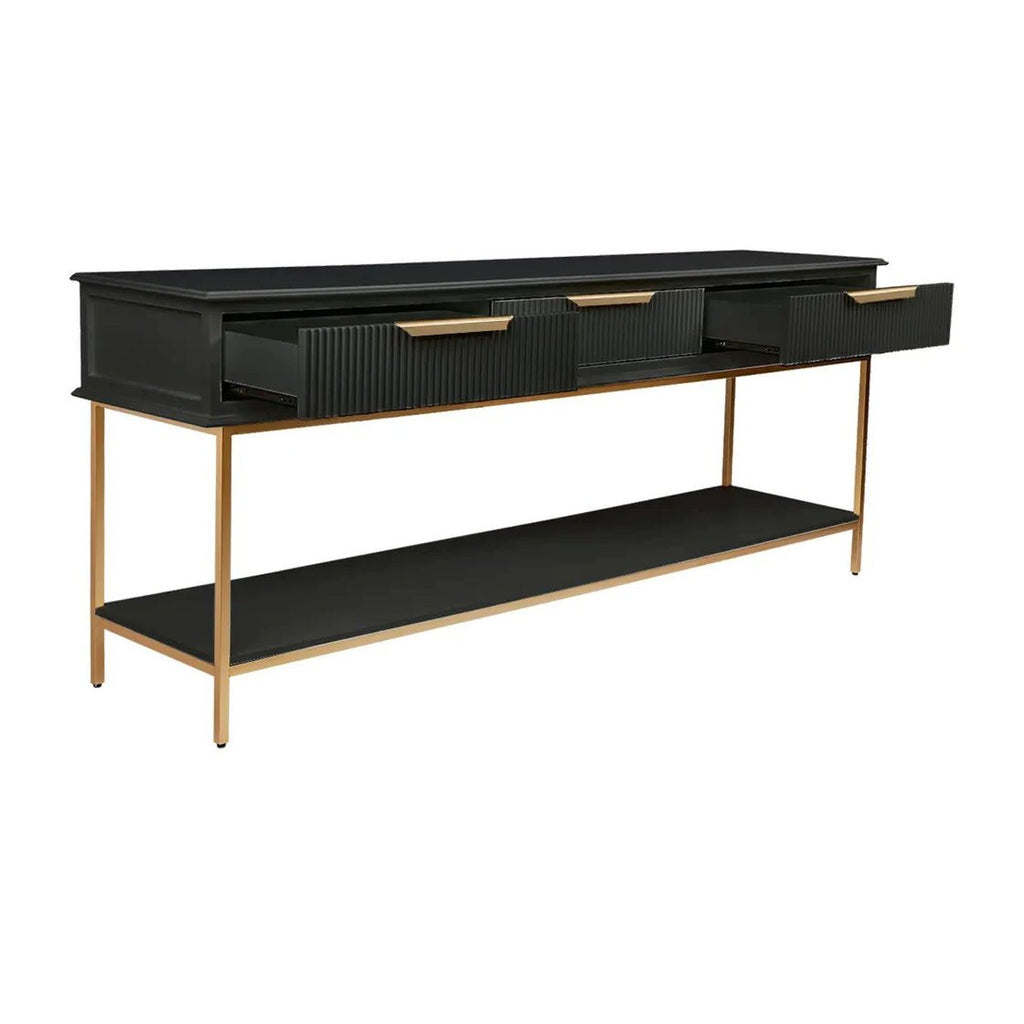 Classic contemporary in design, the large Ripple black console table features three fluted drawer fronts and an elegant streamline profile in a satin white painted finish with contemporary gold metal hardware and iron frame. Also available in a smaller two drawer option, the Ripple range has been designed to slip seamlessly into both classic and modern interiors offering practical and stylish solutions for entry, hallway or living room spaces.