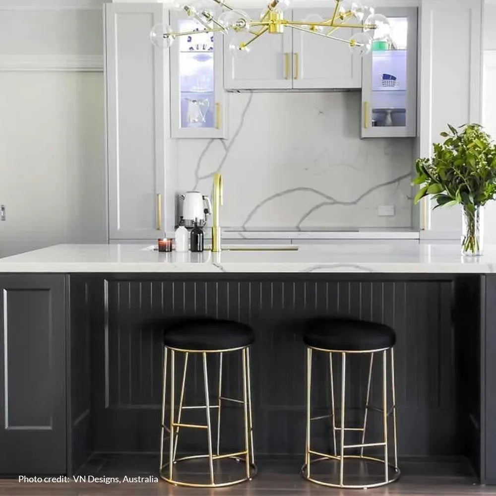 Sculptural in antique gold and tailored in elegant black linen, the Aiden Gold Stool brings urban glamour to the kitchen. Sleek lines, elevated comfort, and refined proportions create a statement that feels effortlessly chic and unmistakably sophisticated.