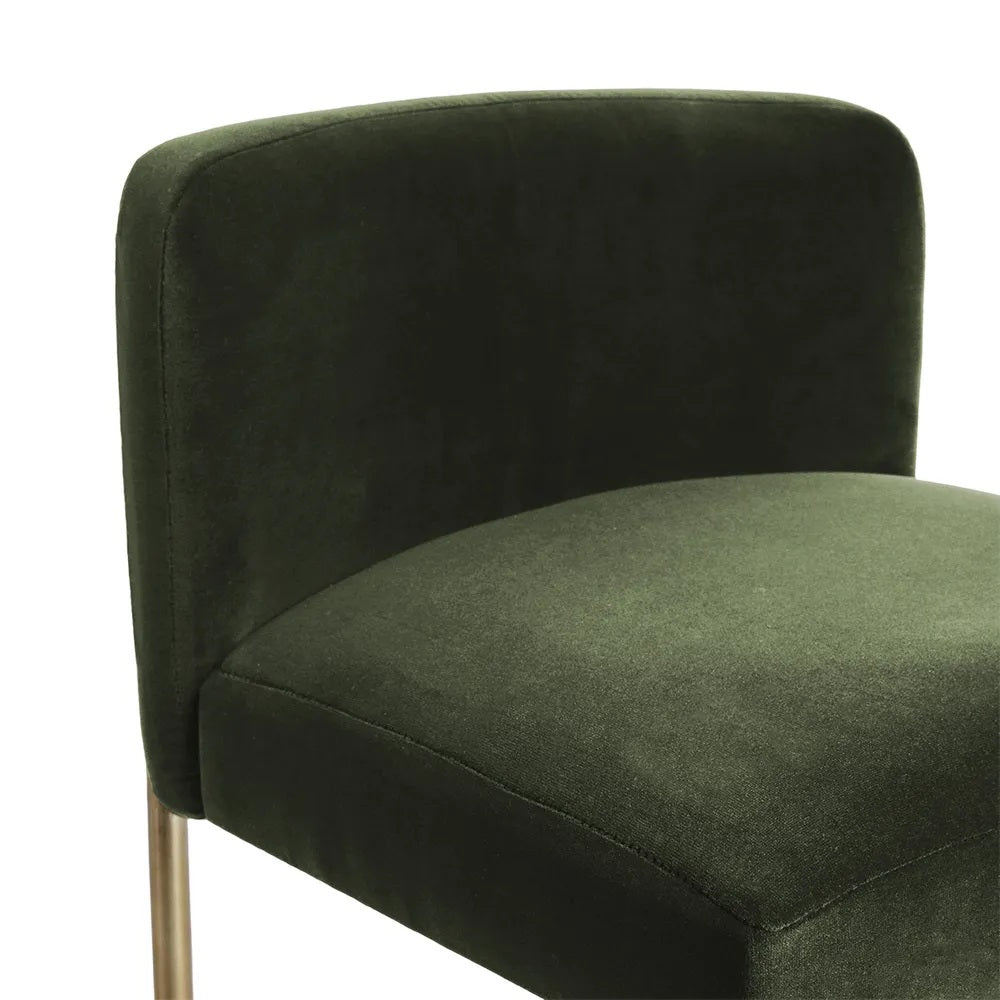 Tailored for modern living, the Loren Kitchen Stool in elegant moss green velvet features a sculpted seat wrapped in textured linen for superior comfort, while its slim antique gold frame adds a touch of refined glamour. Perfectly proportioned for kitchen counters and islands, this versatile piece slips seamlessly into contemporary urban interiors. With its clean lines and luxe finish, the Loren kitchen stool is where everyday functionality meets timeless elegance - designed to enhance the heart of your home.