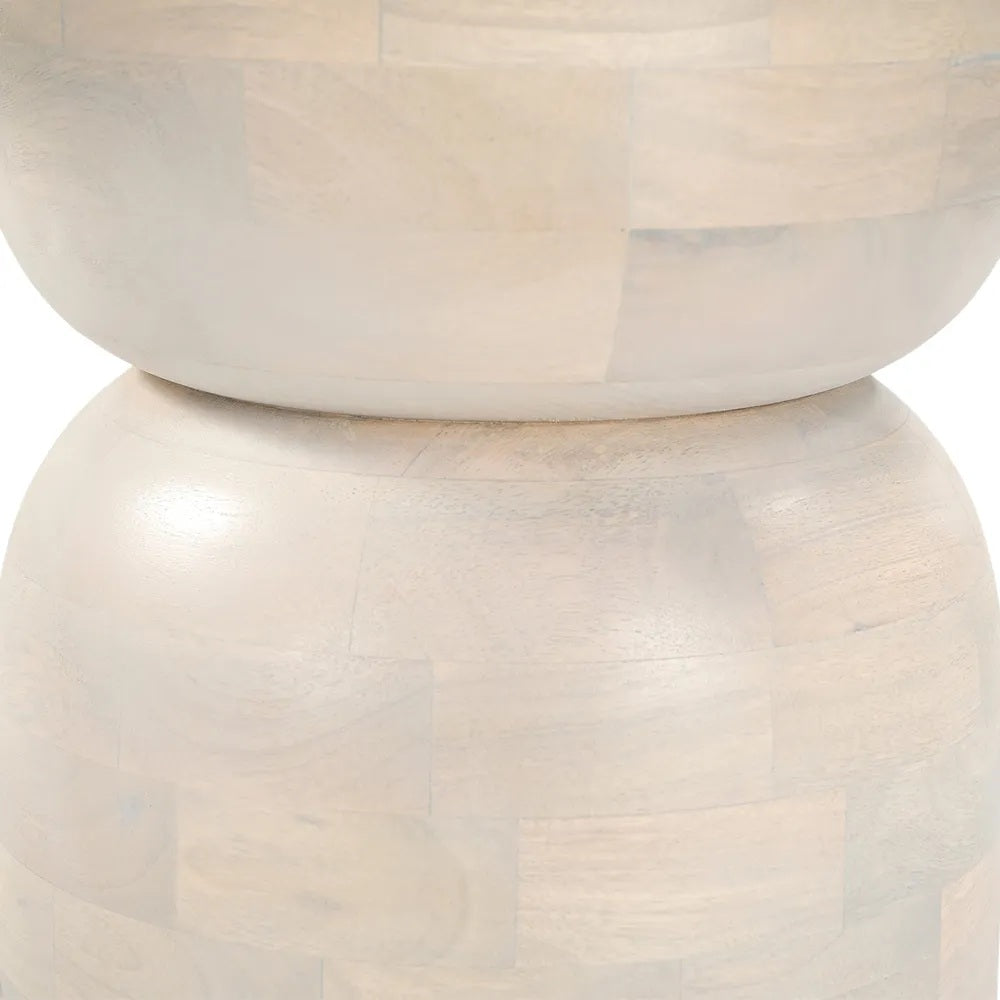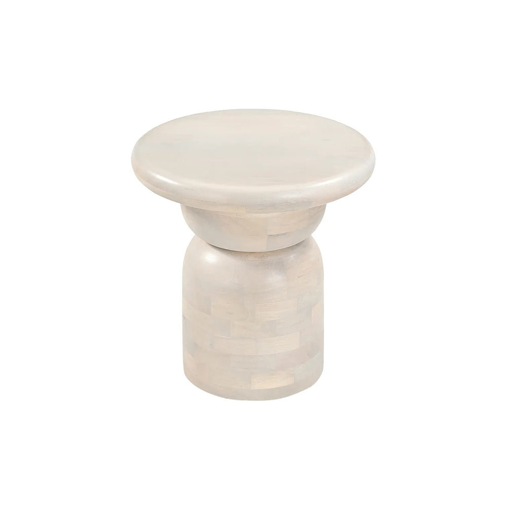 The Denison Side Table delivers sculptural elegance in solid mango wood, finished in soft white stain. A rounded top and curved pedestal base create a bold yet organic silhouette, balancing artisanal craftsmanship with modern refinement—an understated accent that adds warmth, texture, and timeless sophistication to any space.
