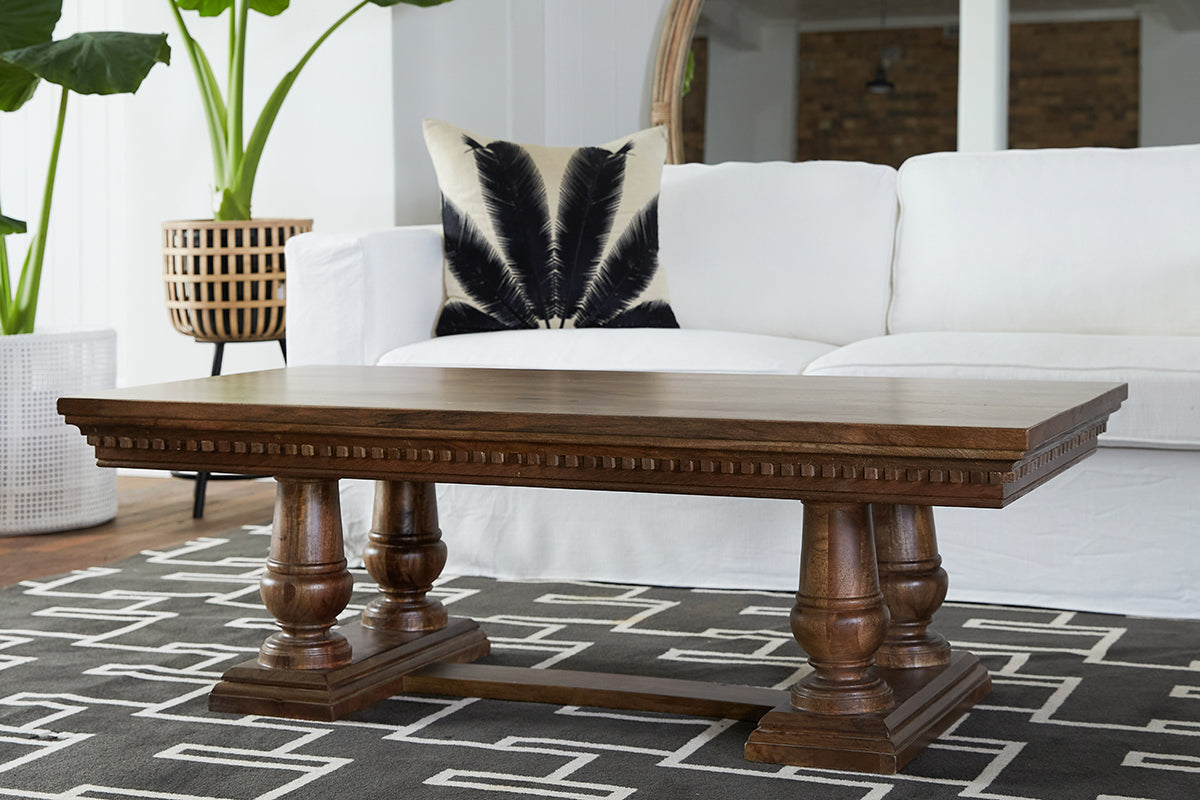 Handcrafted from solid old mango wood, the Louis Coffee Table in Mud Grey features a warm walnut finish and a low-gloss lacquer for durability. Its clean lines and earthy tones make it a timeless centrepiece for modern or rustic interiors. Each piece is unique, with natural timber variations that add authentic character.