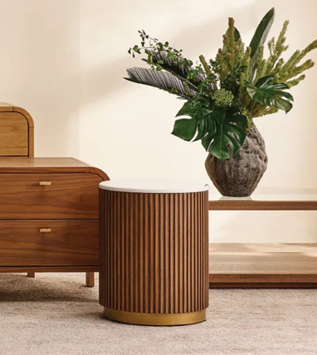 The Como Round Marble Side Table in walnut is a refined accent piece that blends timeless materials with modern design. A smooth Sivec marble top, rich with natural veining, sits atop a fluted walnut-brushed oak base, all grounded by a sleek brushed gold plinth for a subtle touch of glam. The contrast of textures and tones creates visual interest from every angle.