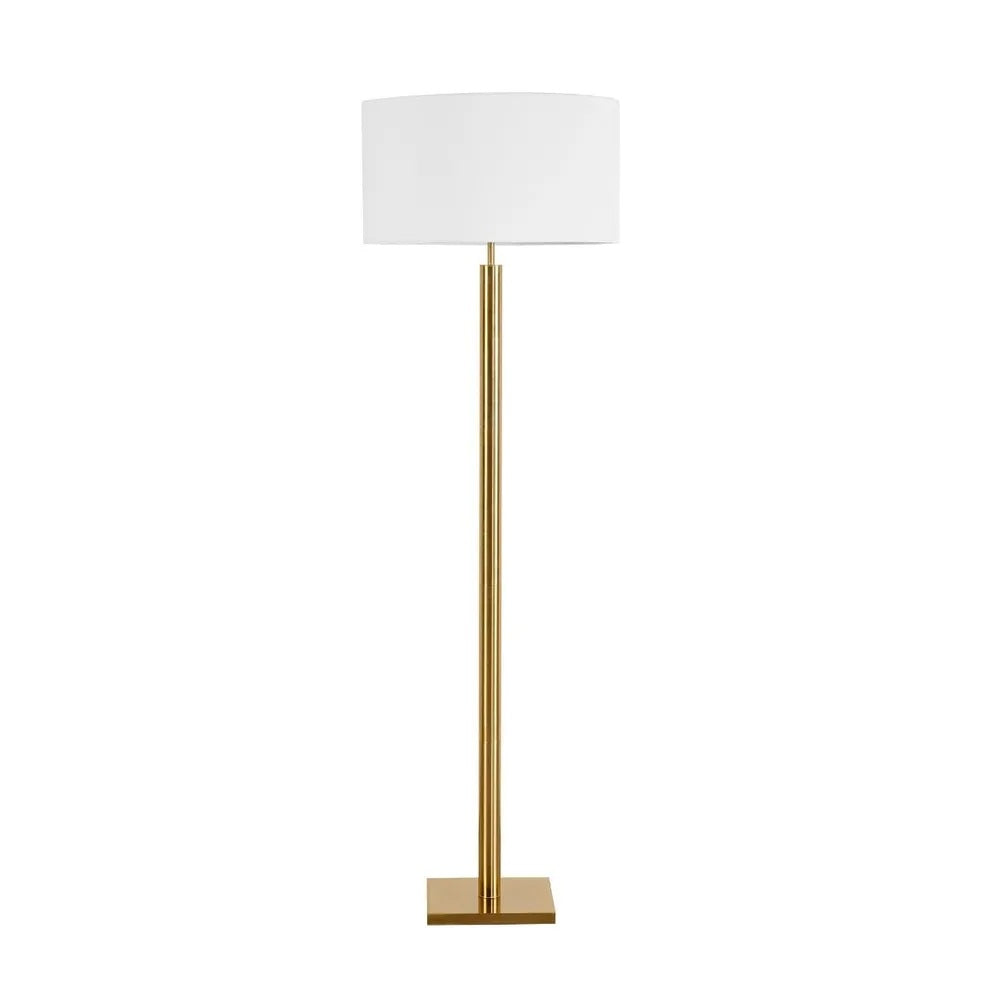 The Kirkwall Floor Lamp blends form and function with a tall cylindrical base, wide off-white drum shade, and sleek black or antique brass finish. Ideal for living rooms or bedrooms, it offers ambient light, smart globe compatibility, and a convenient foot switch.