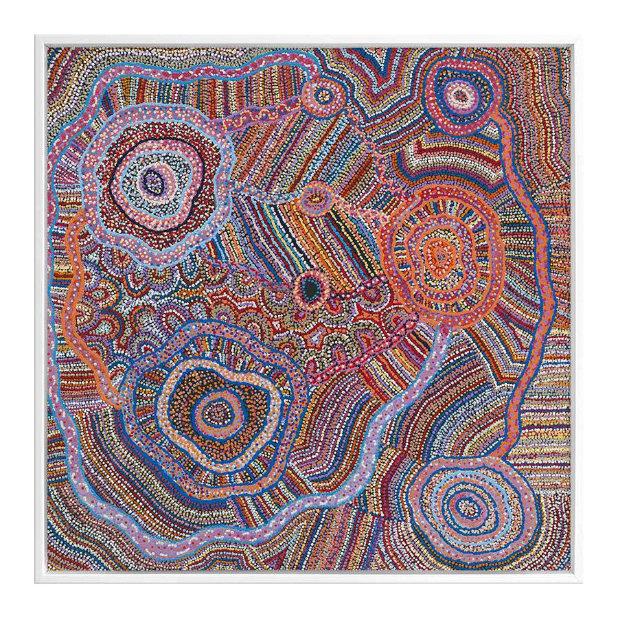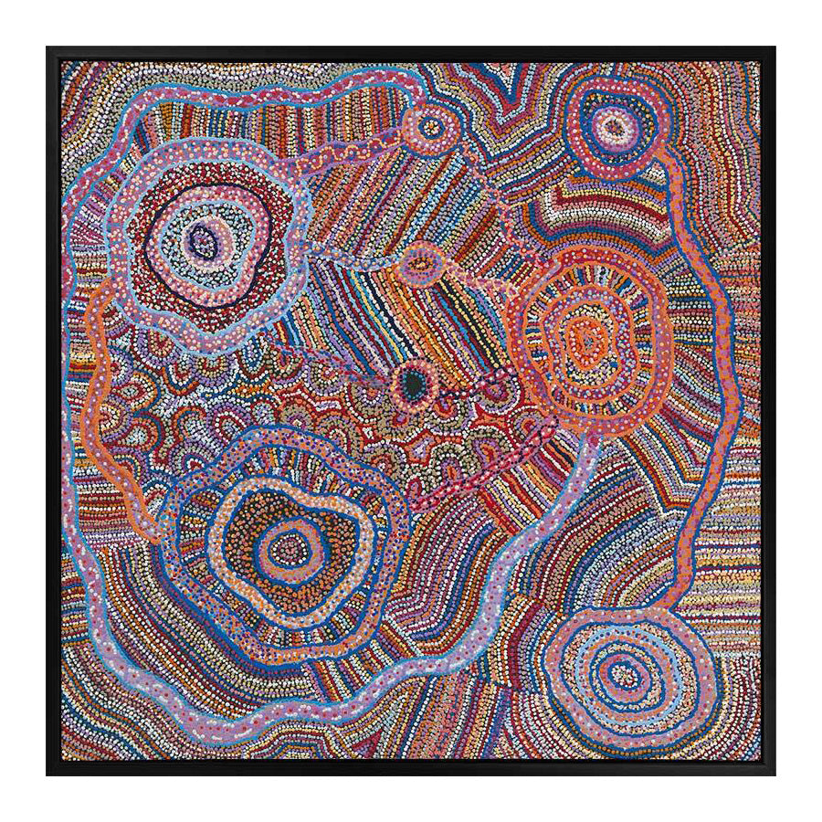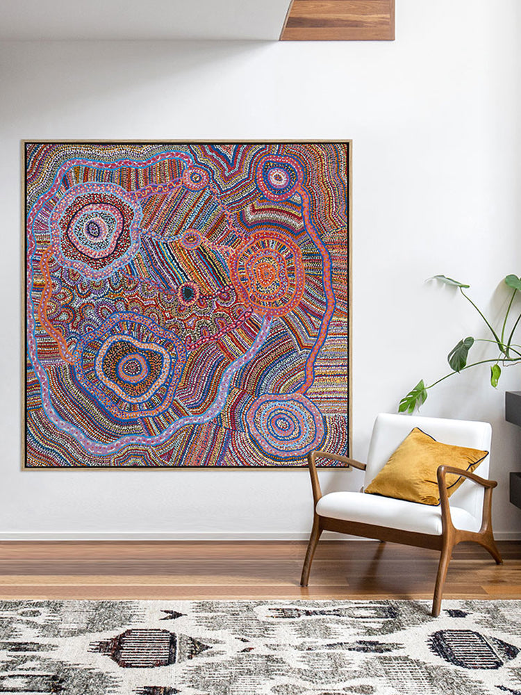 Ngapa Jukurrpa II Canvas Art Print - This vibrant Indigenous Aboriginal artwork features a captivating display of dots and lines emanating from central circles, symbolizing soakages. The wall art's  vivid purples, blues, reds, and oranges form a mesmerizing kaleidoscope. It illustrates the water dreaming narrative, recounting the tale of two Jangala men, rainmakers, who invoked a colossal storm through their songs. This tempest journeyed from east to west, climaxing at Warlura, a waterhole east of Yuendumu in the Northern Territory, where a gecko dispersed it. The relentless storm brought life-giving rains and lightning across the lands, stirring the 'kurdukurdu mangkurdu Jukurrpa' (children of the clouds Dreaming).