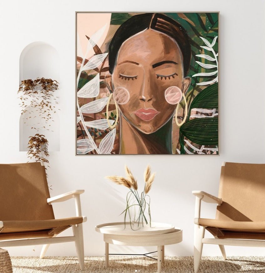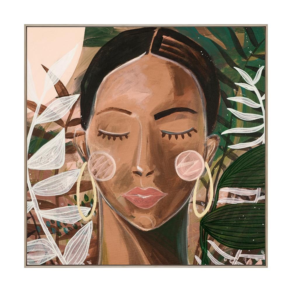 Create a focal point in your room & transform your home interior with our fabulous Shelby Boho Wall Art. This eye-catching, stunning artwork features a 1920's abstract face design print with tan, blush, olive and pink tones and tropical background. Fabulous as a canvas option with a floater frame or as a glass print with a box frame.