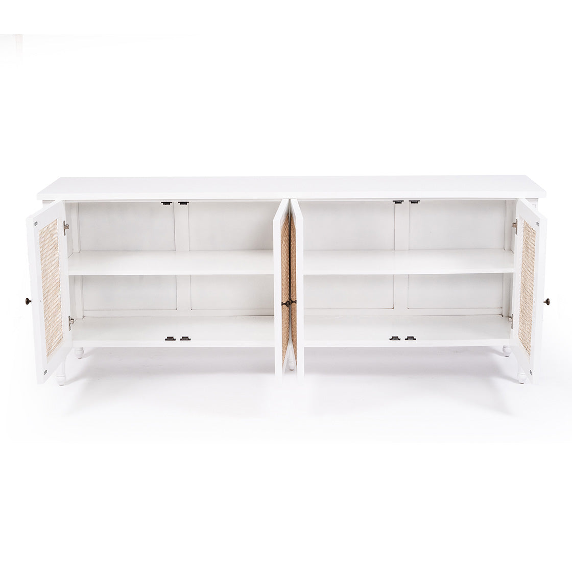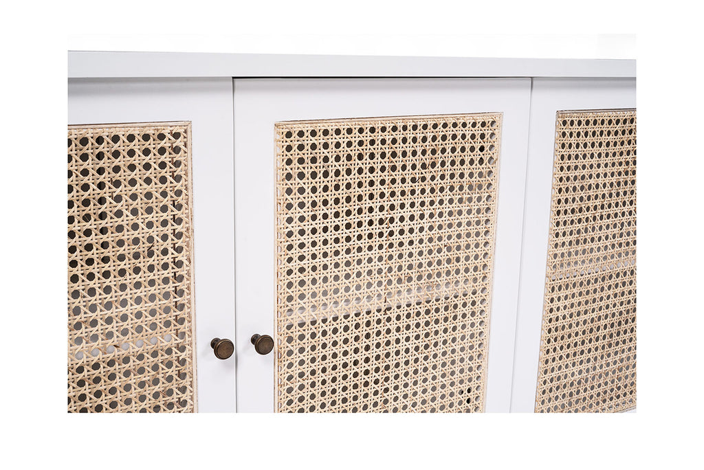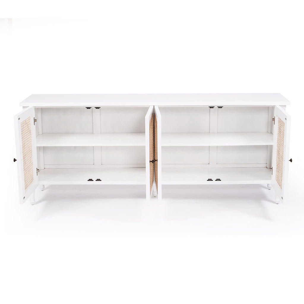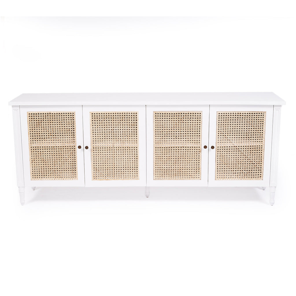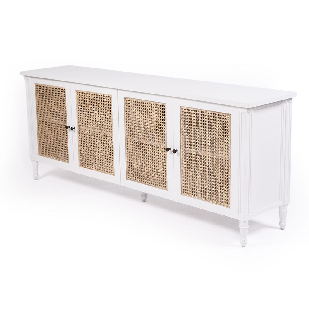 Elegant and enduring, the Raffles White Rattan Buffet is crafted from sustainably sourced mahogany with a smooth semi-gloss white finish. Classic rattan panelling adds texture and a breezy charm, while four doors with internal shelving offer versatile storage.