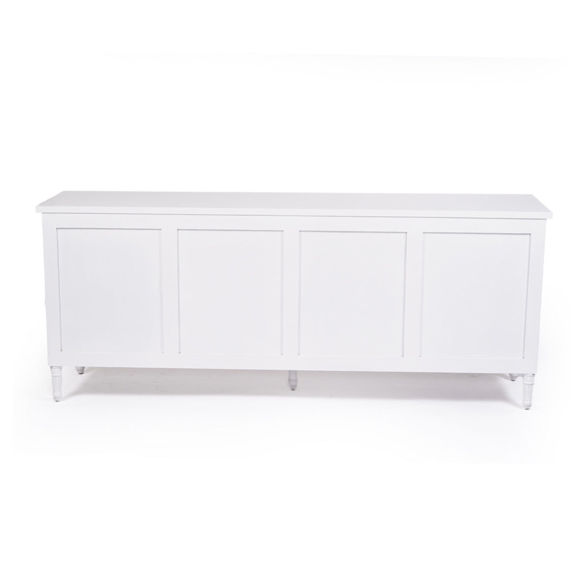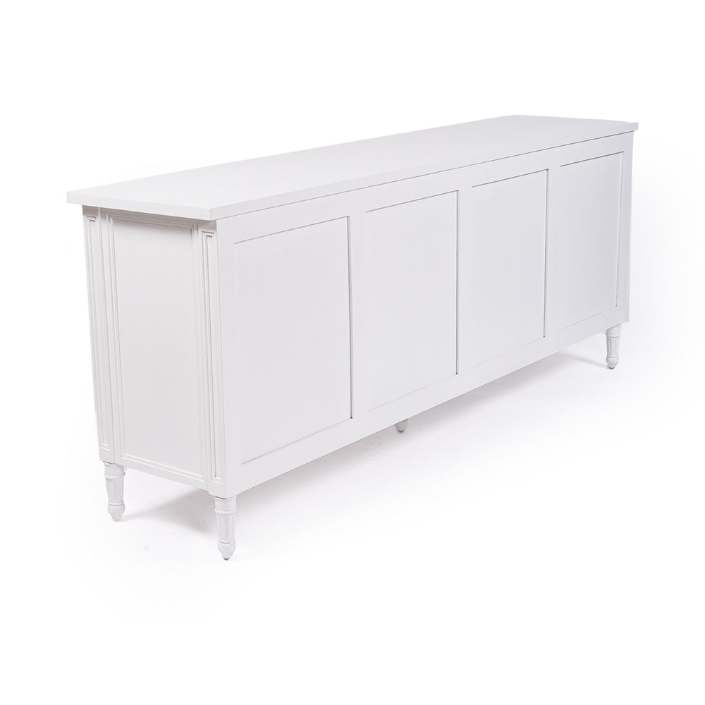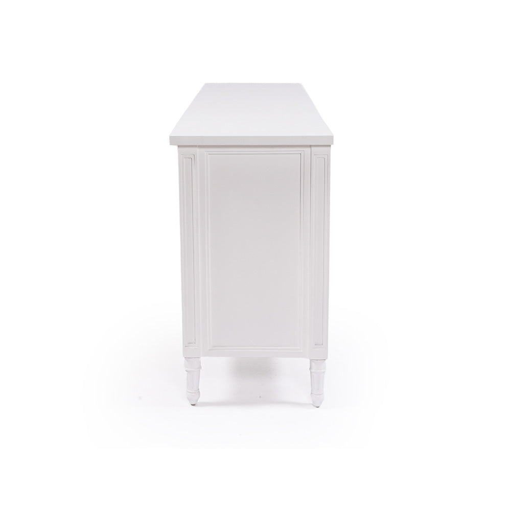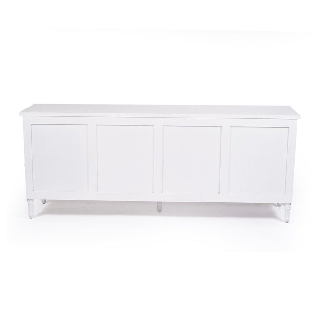 Elegant and enduring, the Raffles White Rattan Buffet is crafted from sustainably sourced mahogany with a smooth semi-gloss white finish. Classic rattan panelling adds texture and a breezy charm, while four doors with internal shelving offer versatile storage.
