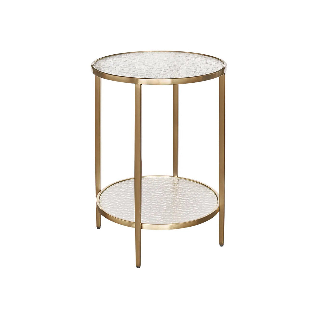 The Chloe Rippled Glass Side Table in Gold is a sophisticated accent piece that combines elegant form with subtle textural detail. Showcasing a clear rippled tempered glass top and lower shelf, it’s beautifully supported by a brushed gold stainless steel frame for a polished, high-end look.