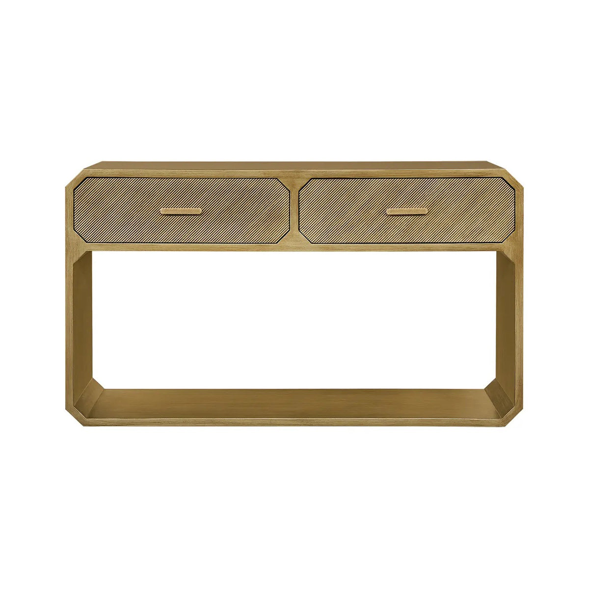 Decadent, and unapologetically sleek, the Cooper Console Table in antique gold's sharp silhouette and ribbed ashwood veneer radiate quiet power. Brushed antique gold handles punctuate the double drawers with a touch of tailored polish, while the open-frame design keeps it impossibly chic and weightless. At 140cm wide, it’s the perfect canvas for bold styling . Designed to command attention in hallways, dining rooms, or living spaces. Also available in White and Black.
