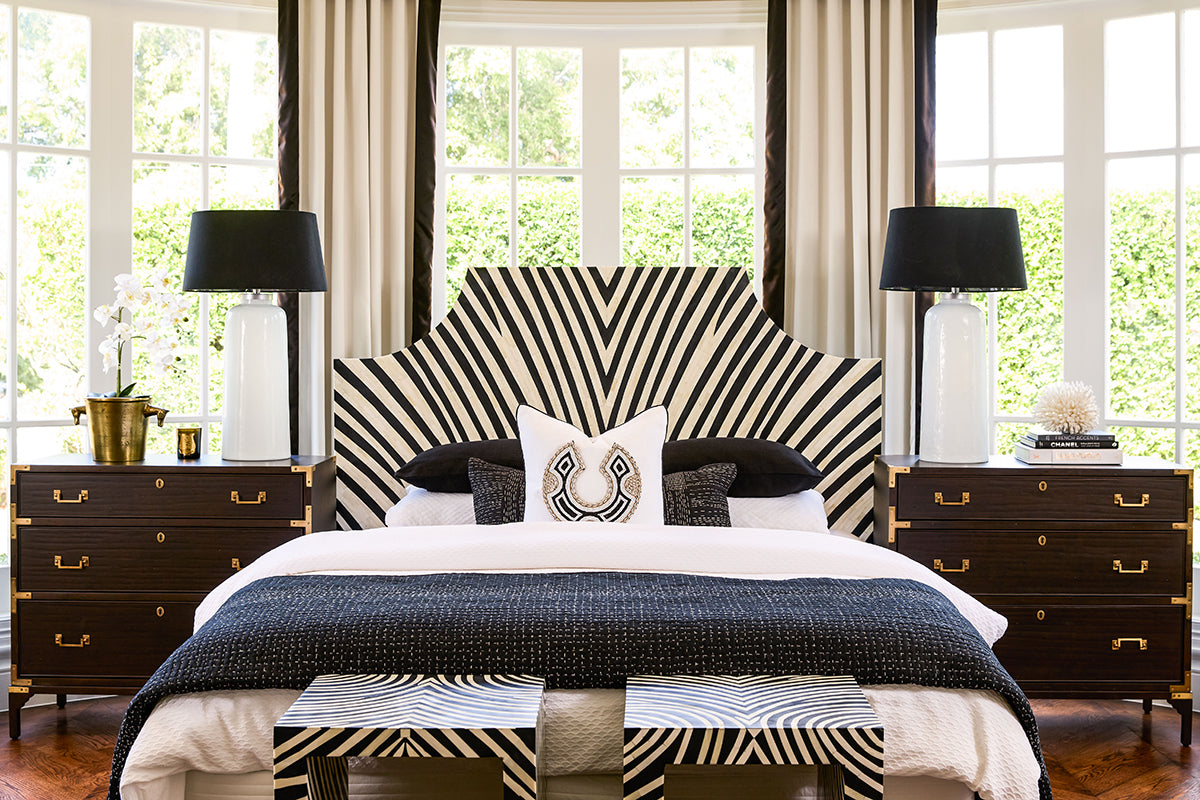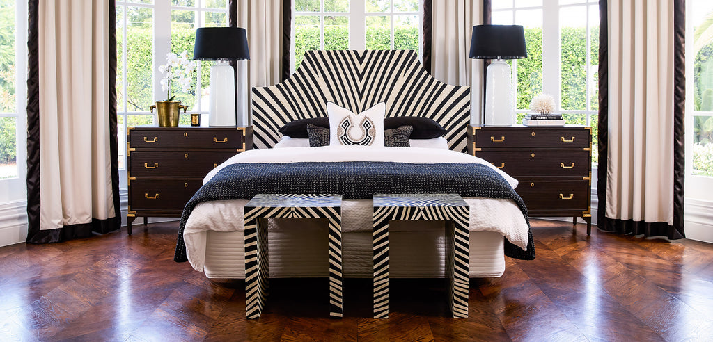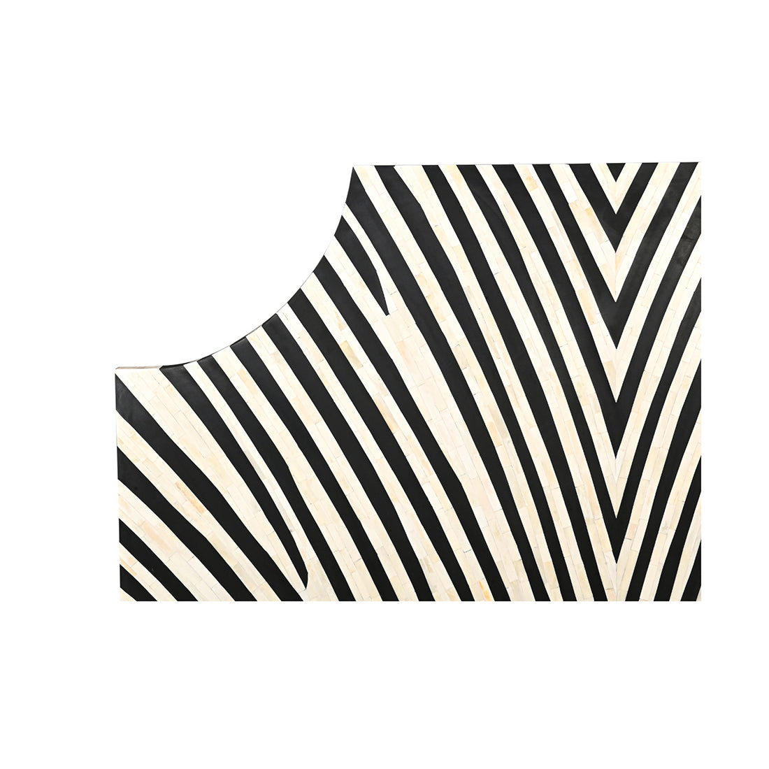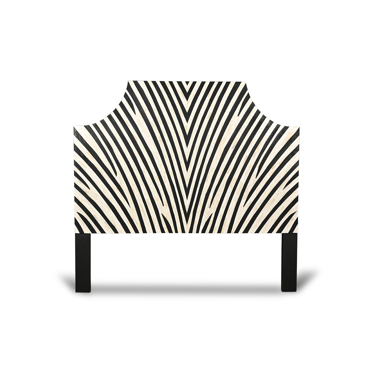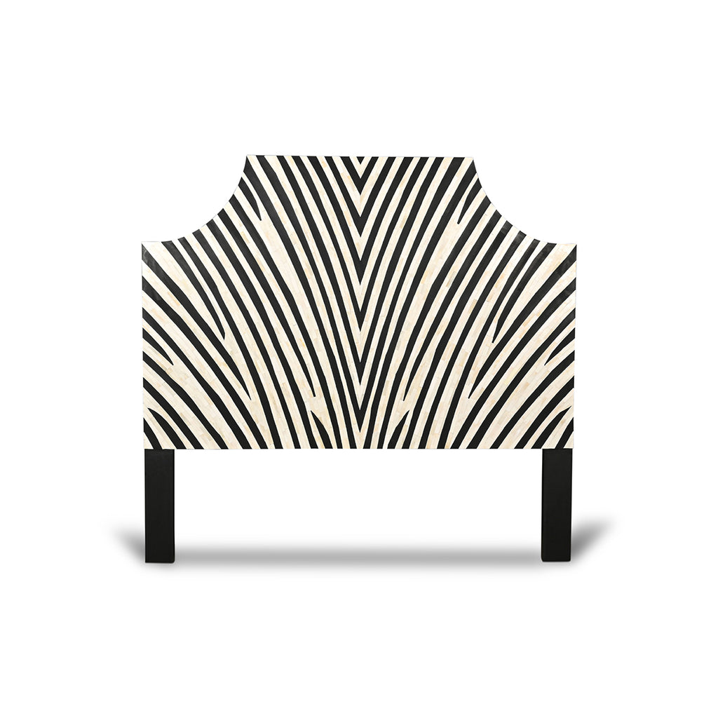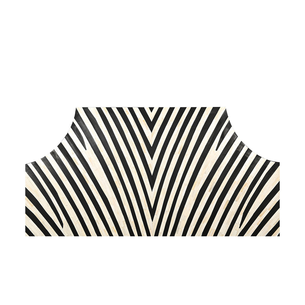 Hand-carved bone inlay forms a striking safari motif, turning this Savannah bed head into an artisanal, monochrome statement of global glamour. A zebra-inspired bone inlay pattern delivers graphic elegance. This handcrafted bed head brings rich craftsmanship and luxurious styling to your interiors.