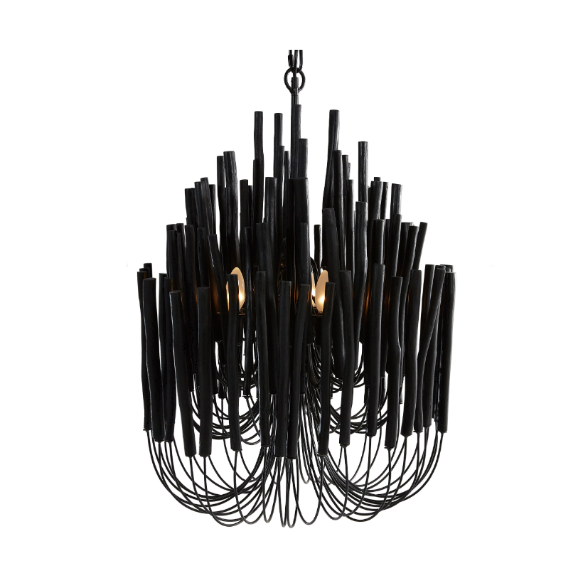 The Wood Candlestick Lamp in Black brings bold sophistication to any interior. Handcrafted from organic timber, its sculptural candle-like forms create dramatic depth and atmosphere, while the rich black finish delivers timeless luxury—an unforgettable chandelier designed to elevate refined, design-forward spaces.