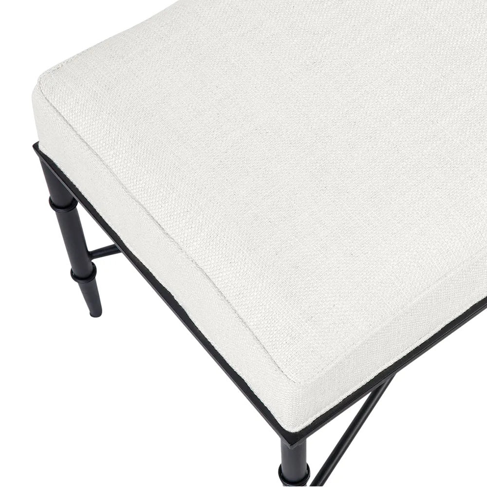 This versatile ottoman features stunning banded bamboo-inspired iron legs in a matt black finish. Its natural linen blend cushioned top adds classic texture while the tailored self-piping finish complements its refined look.