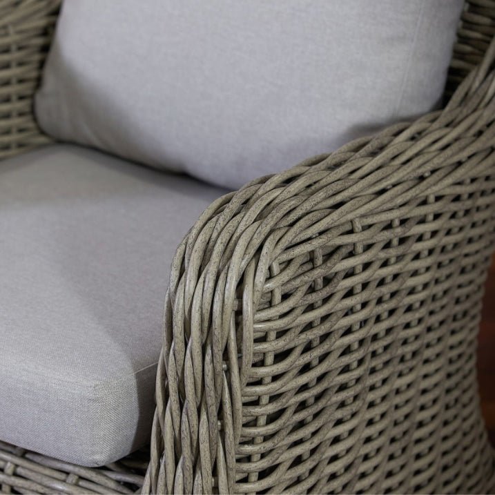 Relax in style with our French-Grey Harrison Lounge Chair, a masterpiece of unparalleled craftsmanship. Handcrafted with a premium synthetic weave and aluminium frame, this chair enhances your outdoor area with its sophistication and glamour. Perfect for enjoying sunny days or starlit nights, it combines comfort with durability through its water-resistant fabric. Available in Natural or French Grey finishes, the Harrison Lounge Chair adds a touch of refined elegance to any outdoor setting.