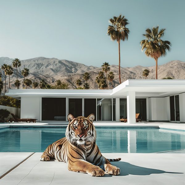 Immerse yourself in the wild beauty of the Chino Tiger Wall Art, where a majestic tiger lounges by a serene pool, basking in the brilliant Palm Springs sunshine. This captivating piece fuses the tranquil allure of the landscape with the tiger's fierce elegance, adding a touch of exotic sophistication to any space.