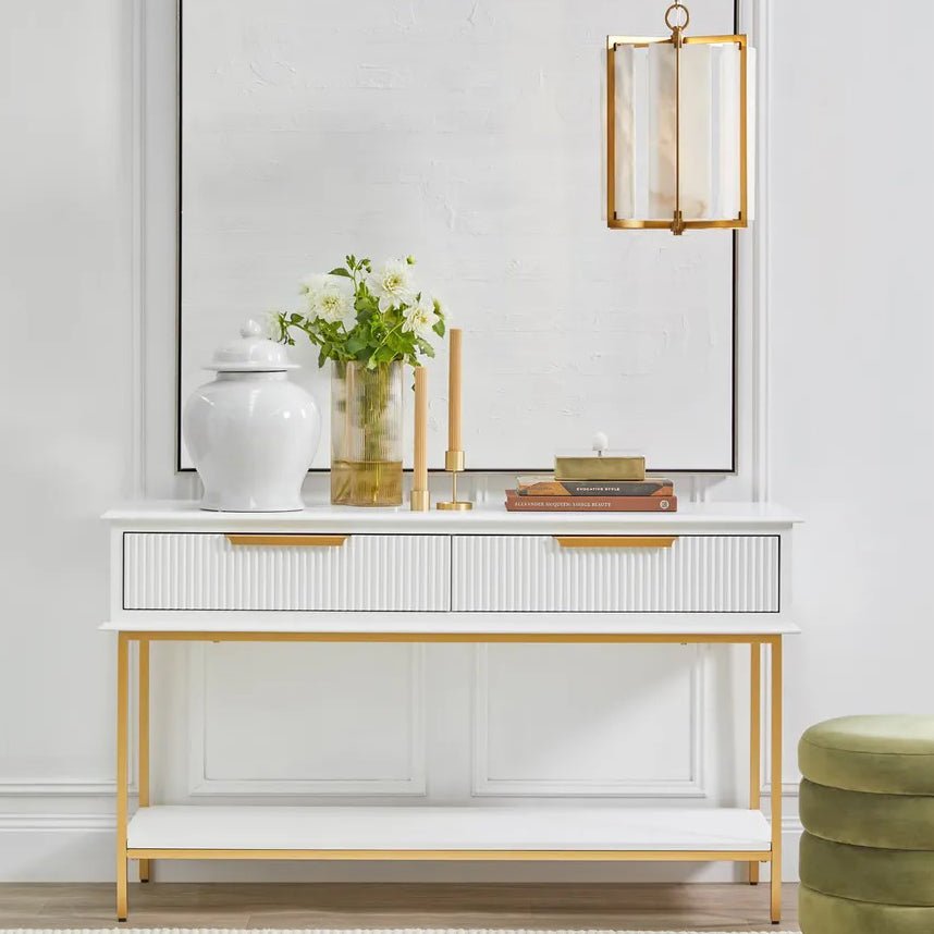 Classic contemporary in design, the small Ripple console table features fluted drawer fronts and an elegant streamline profile in a satin white painted finish with contemporary gold metal hardware and iron frame. Also available in a 2m length, three drawer option, the Ripple range has been designed to slip seamlessly into both classic and modern interiors offering practical and stylish solutions for entry, hallway or living room spaces.