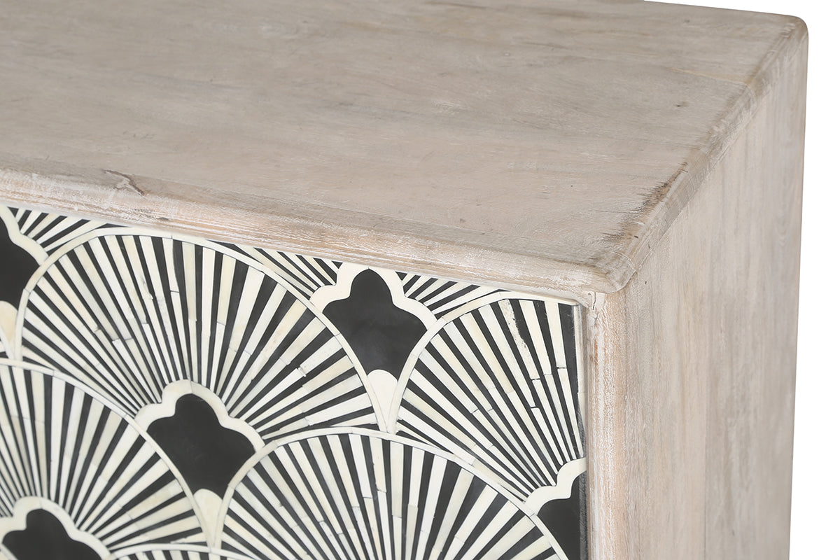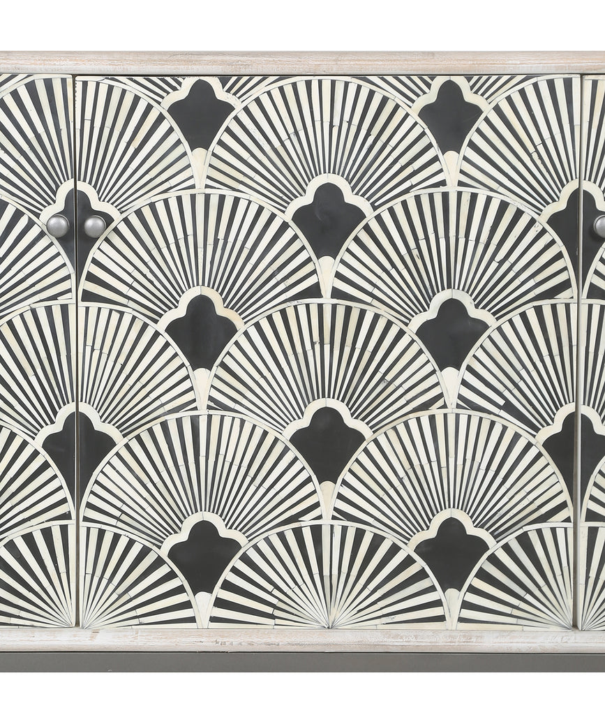 Elevate your interiors with the Kyoto Bloom Bone Inlay Buffet. Featuring a striking monochrome floral motif, this handcrafted piece blends timeless elegance with contemporary design. Its intricate detailing and sleek silhouette offer both beauty and function, perfect for storing dining essentials while making a bold statement in any sophisticated living or dining space.