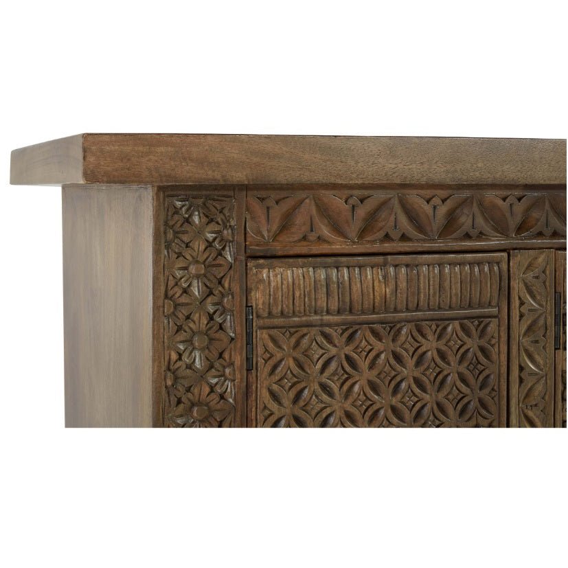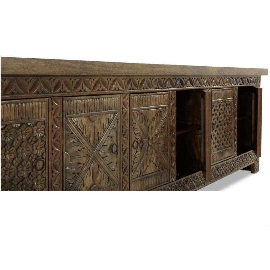 Indulge in the timeless allure and impeccable craftsmanship of our Cannes Buffet Sideboard, an exquisite addition to elevate your living space with its distinctive charm and enduring quality. The Cannes Sideboard has been meticulously hand-carved from the finest solid mango wood timber. Every detail of this masterpiece has been crafted with utmost care and precision, resulting in a stunning piece that exudes timeless elegance.
